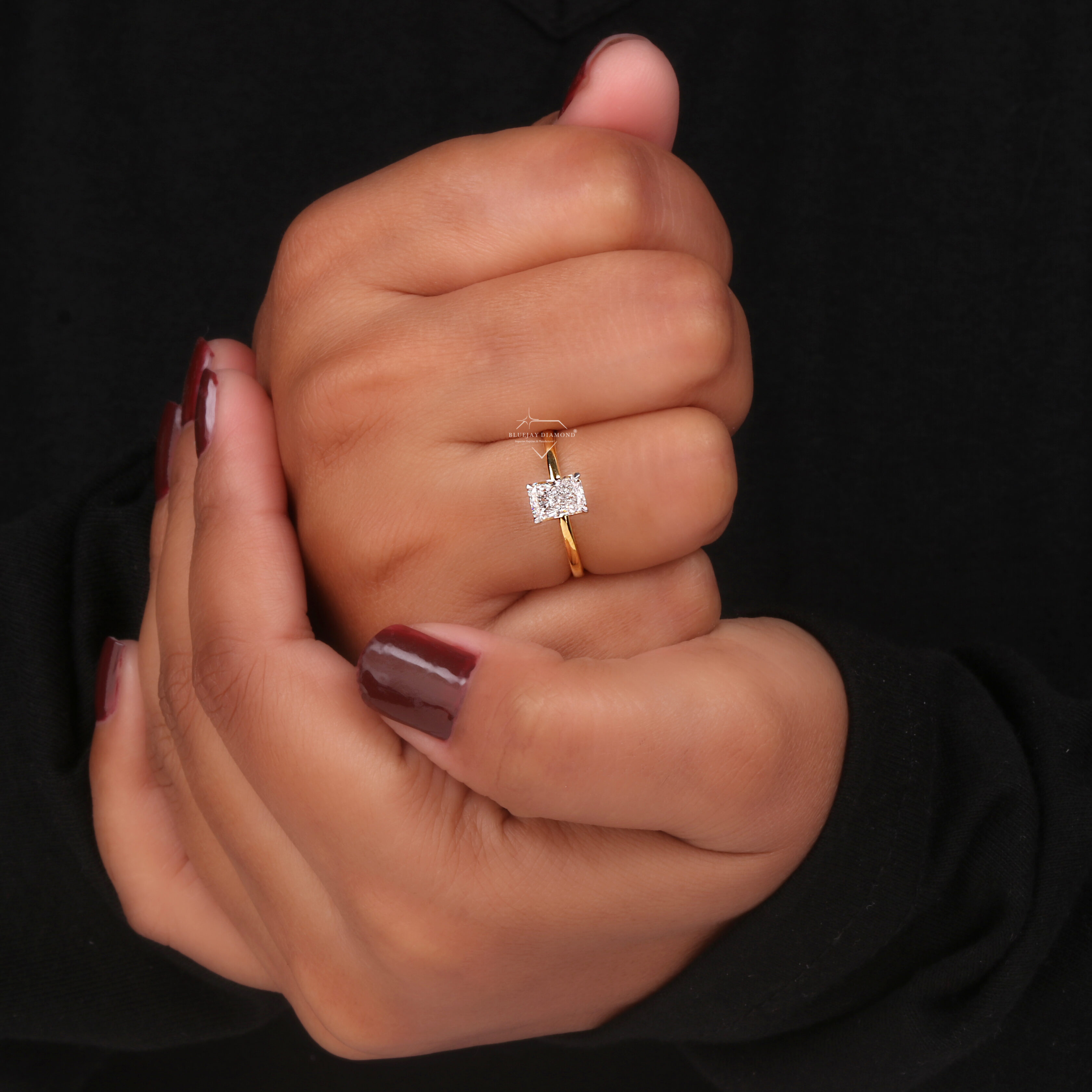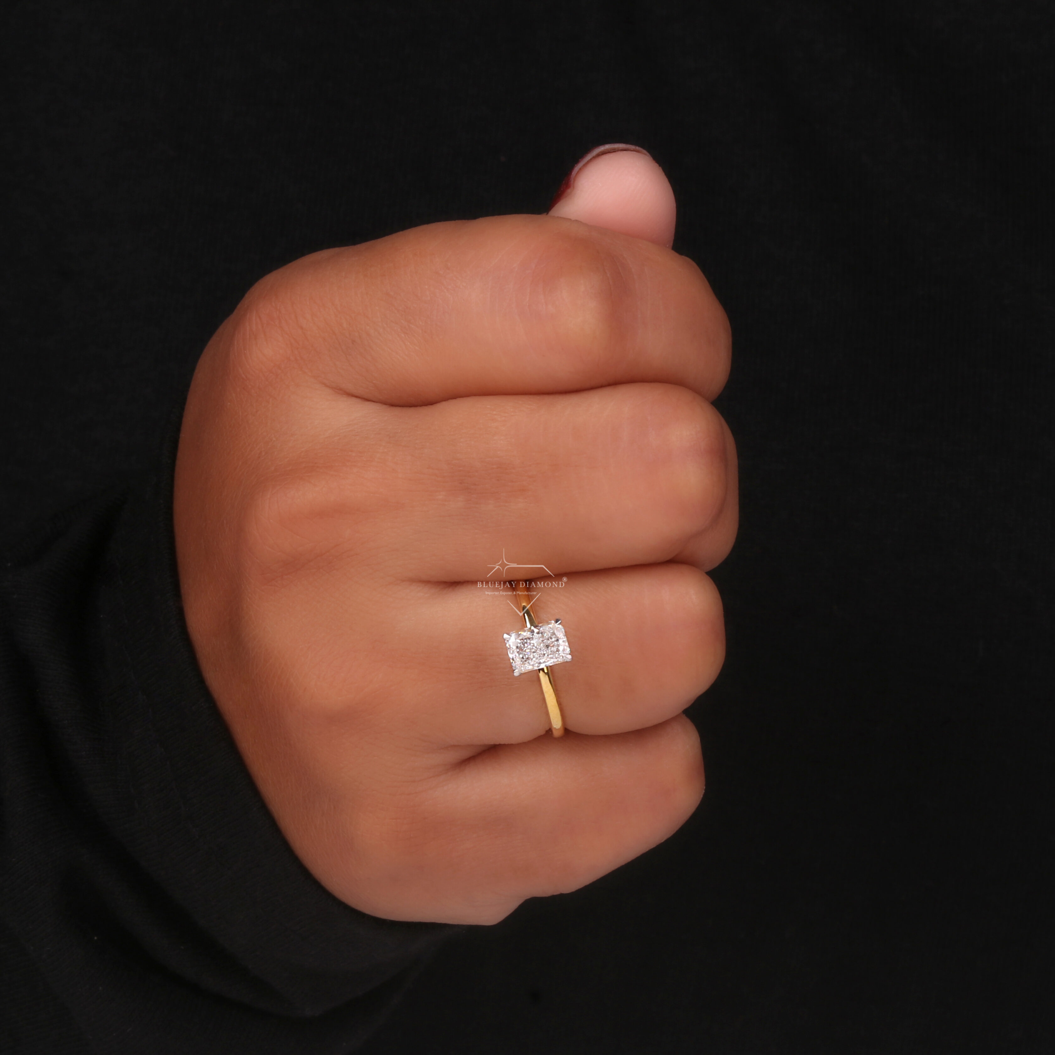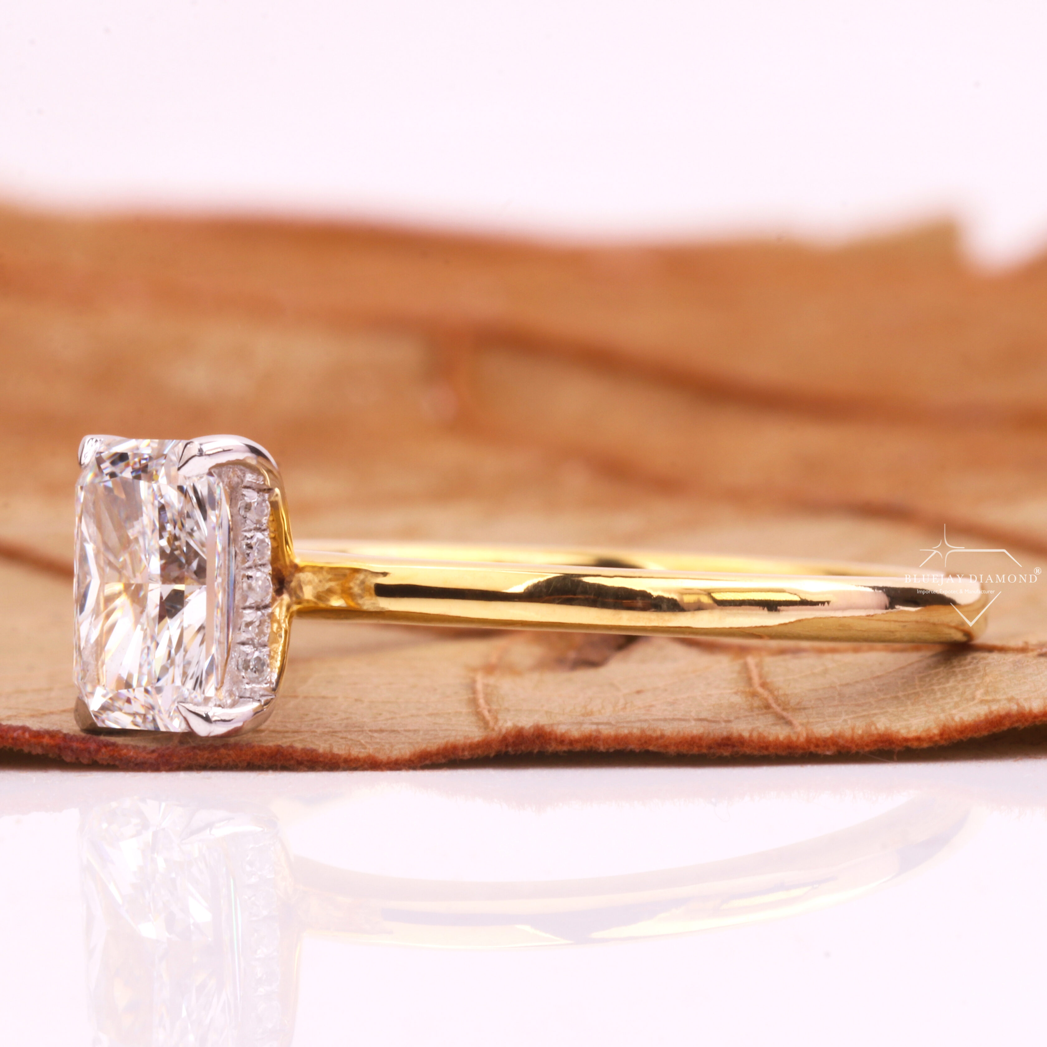 - Diamond Shape: The centerpiece is an elongated Radiant Cut diamond.