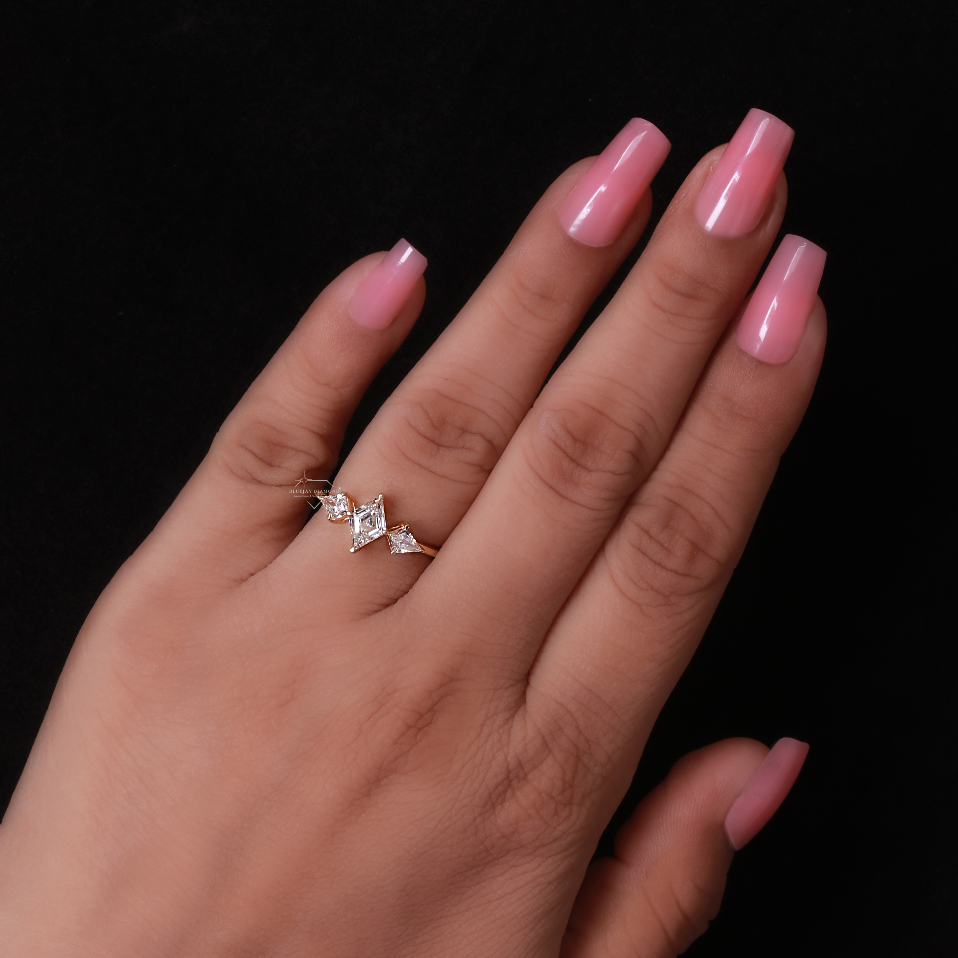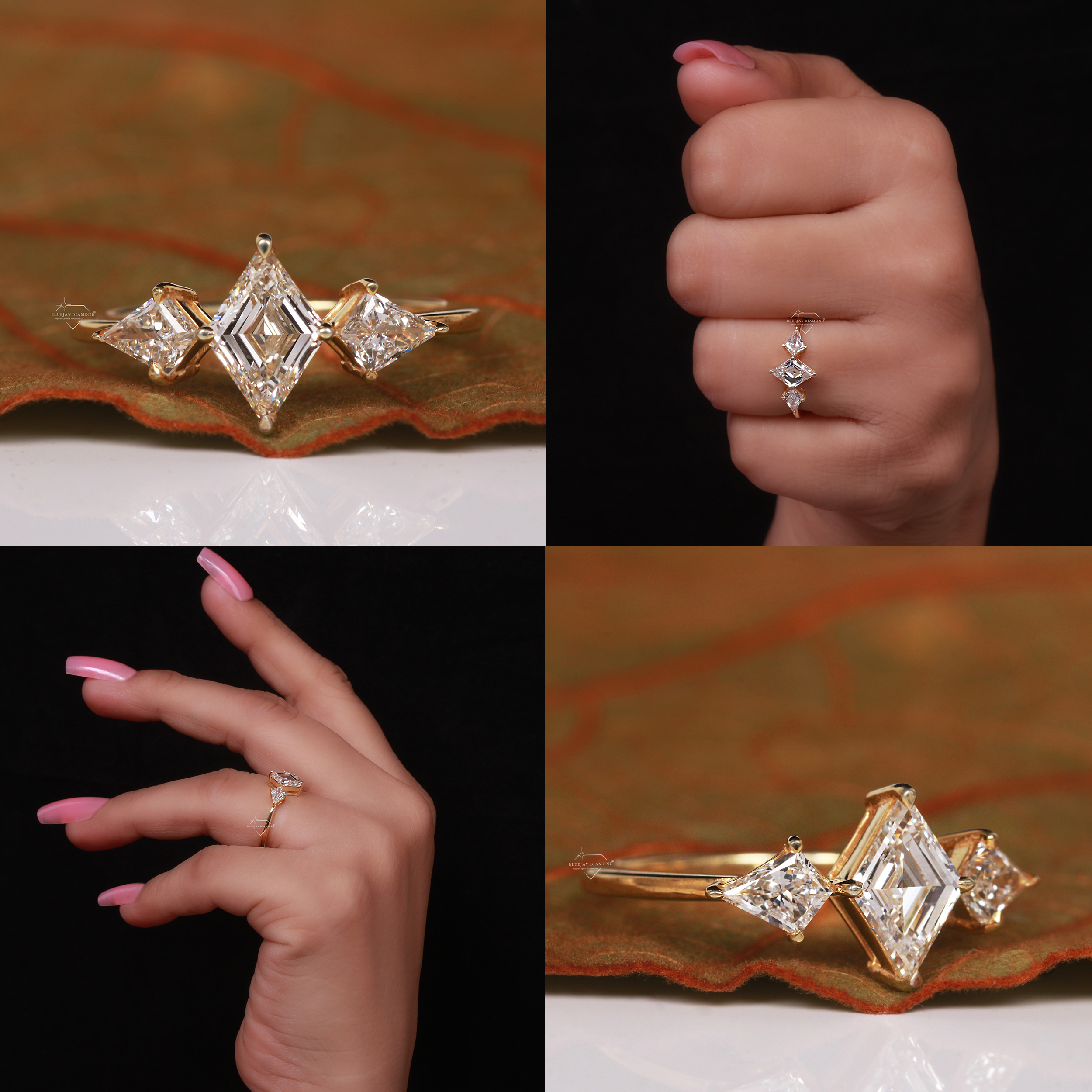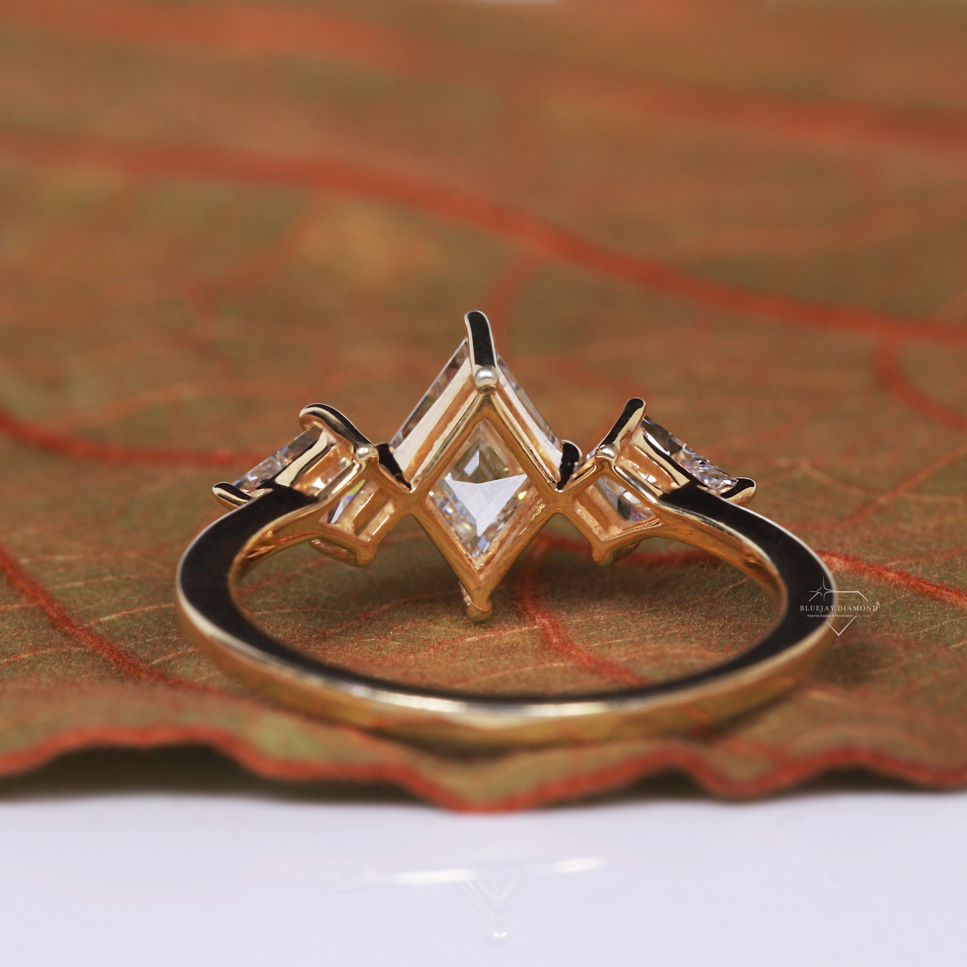- Side Diamond Shapes: The two side stones are kite-cut diamonds.