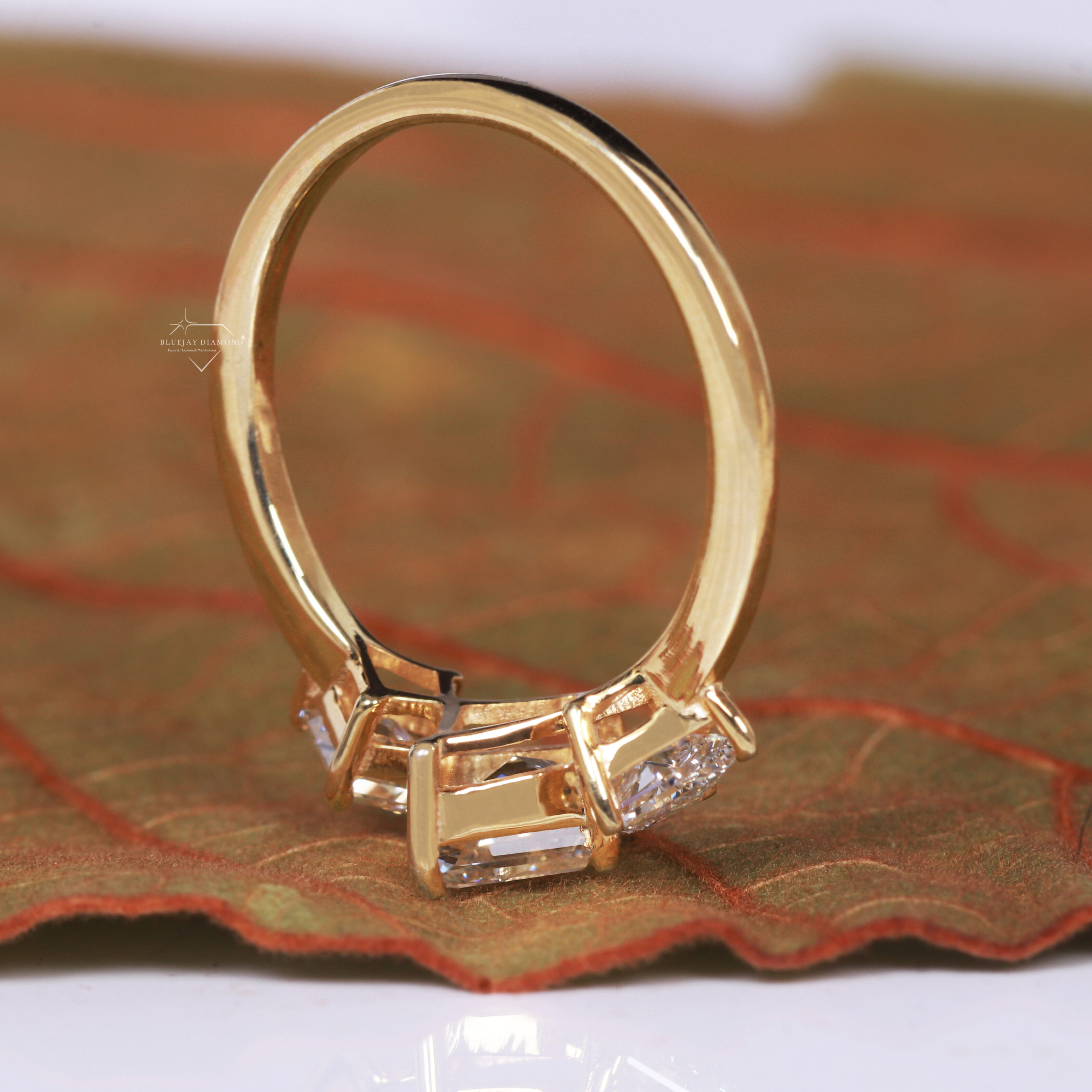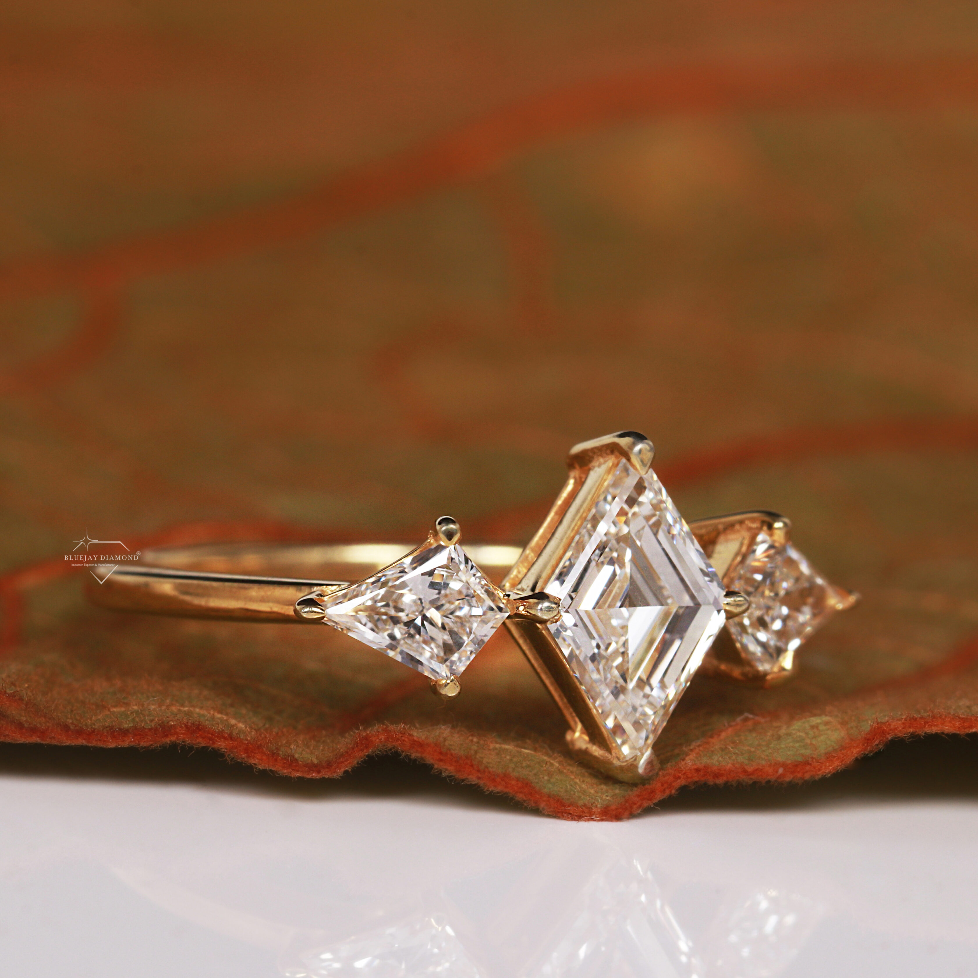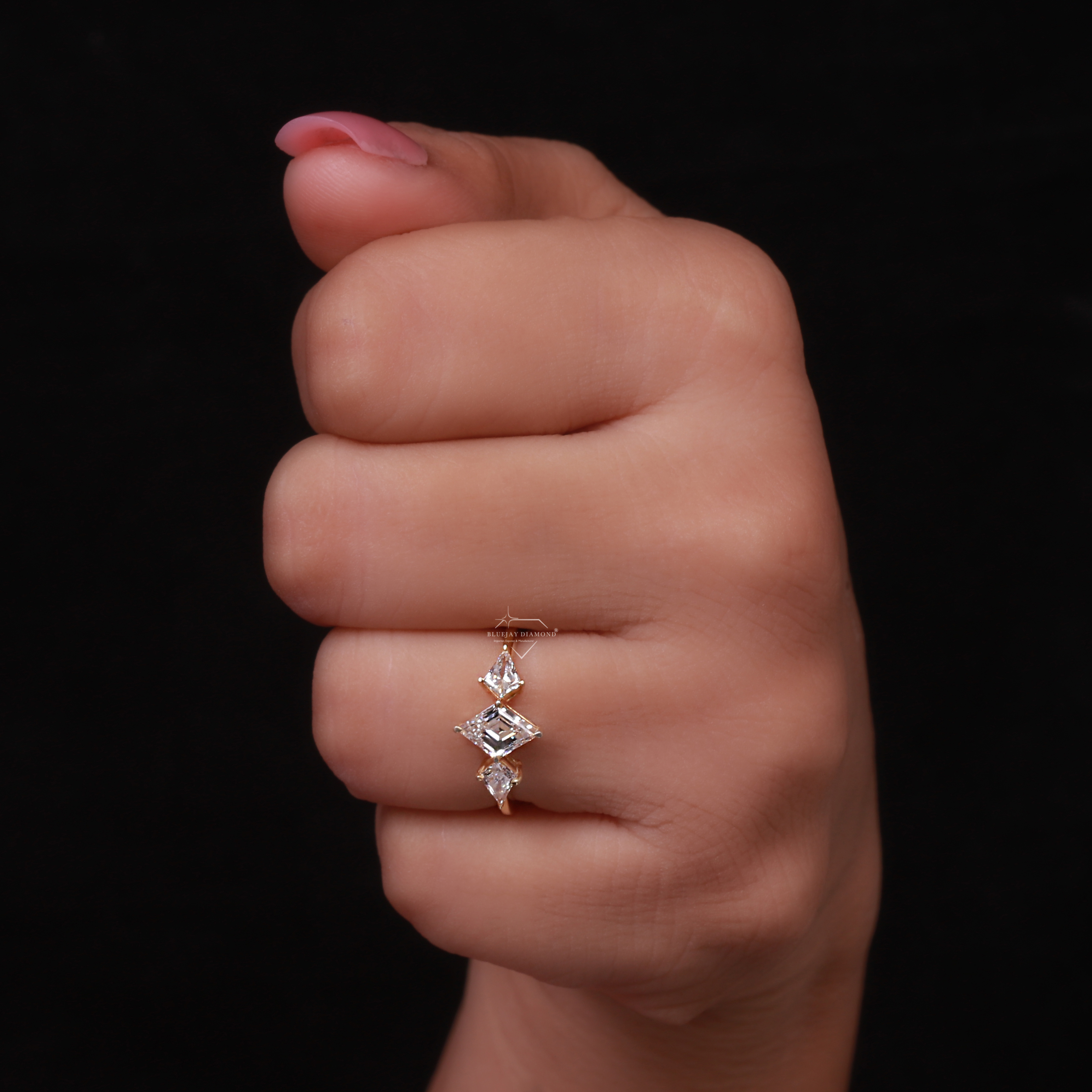- Side Diamond Shapes: The two side stones are kite-cut diamonds.