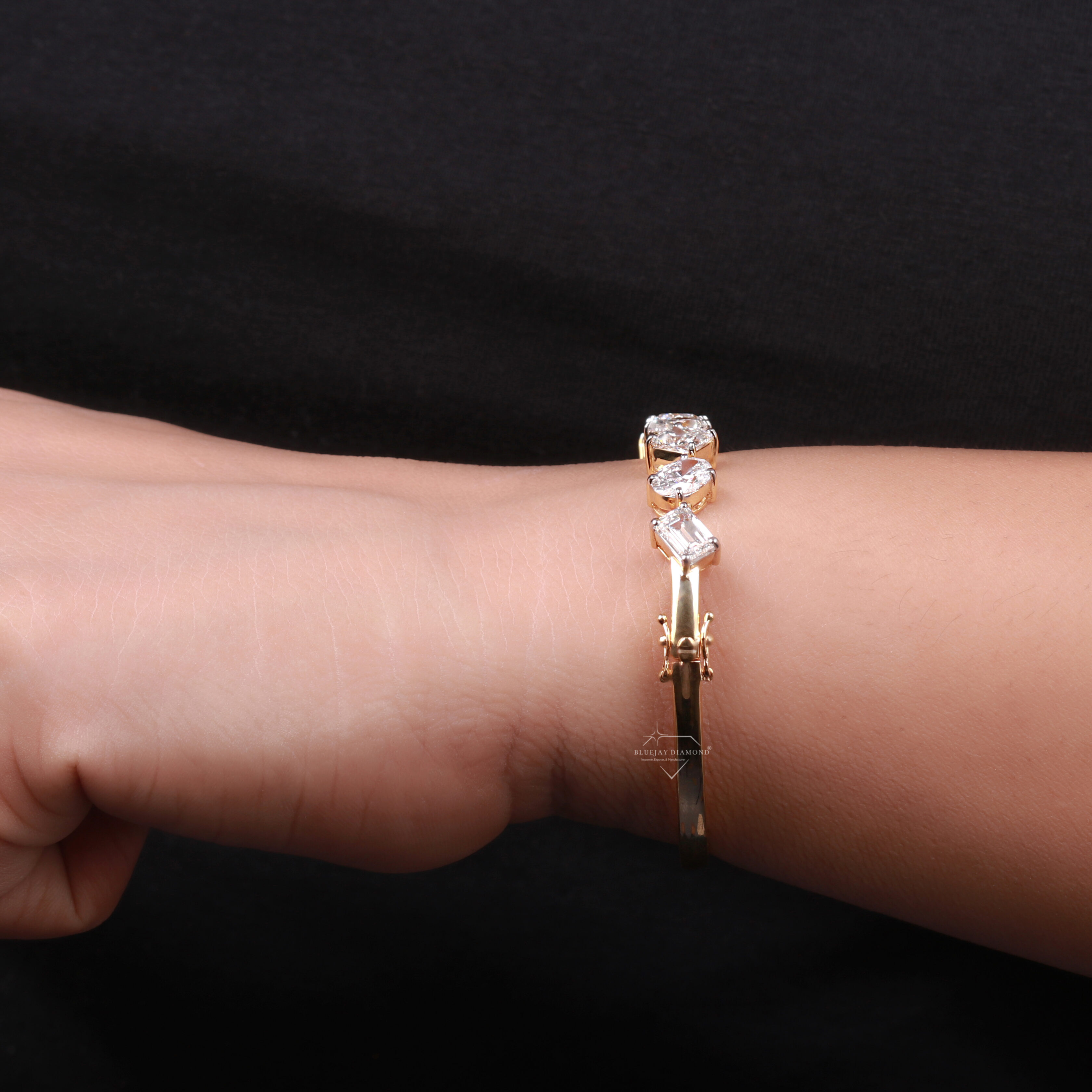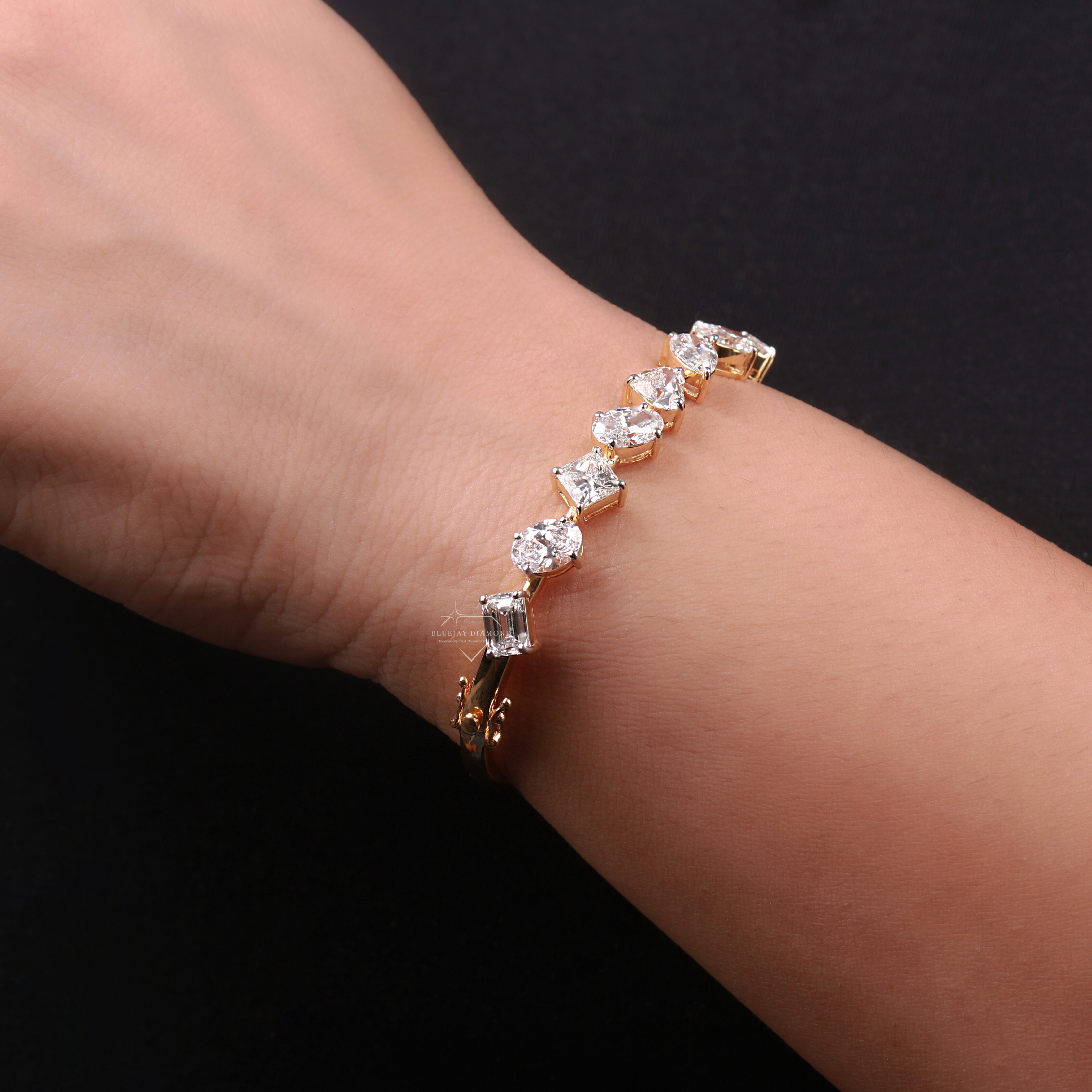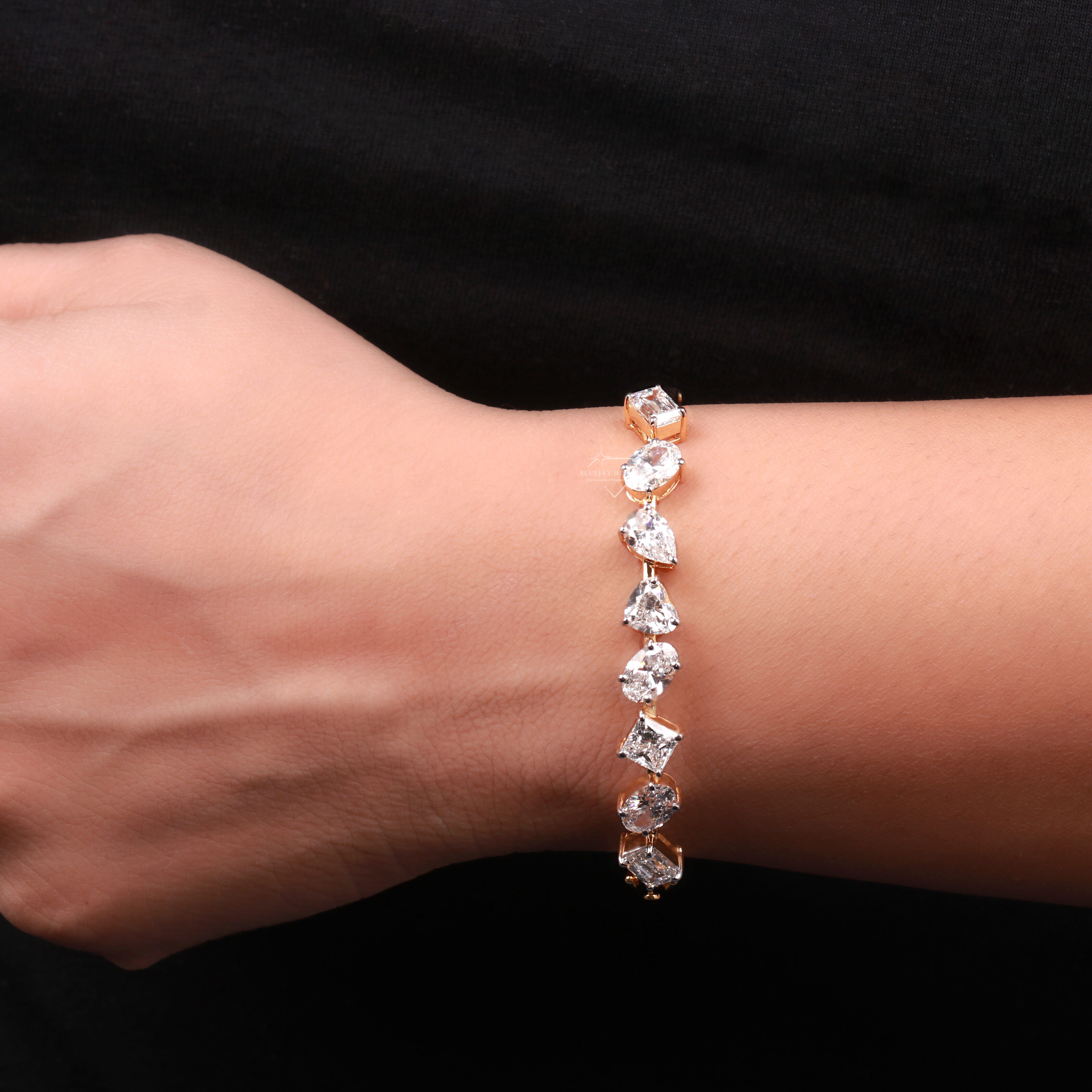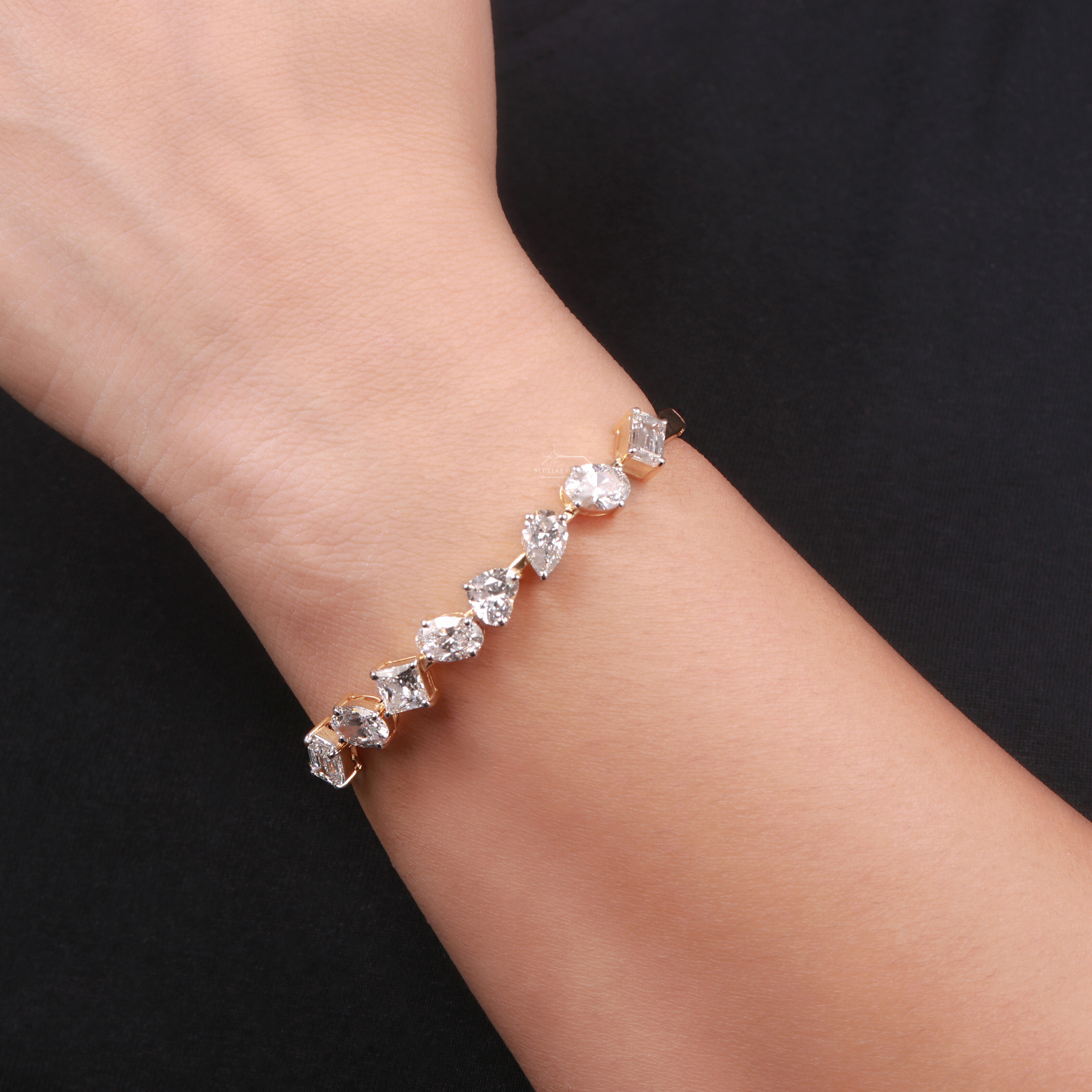 - Diamond Shapes: The bracelet incorporates a variety of diamond shapes, including Emerald, Oval, Pear, Heart, Princess Cut. The alternating shapes create a dynamic and playful rhythm.