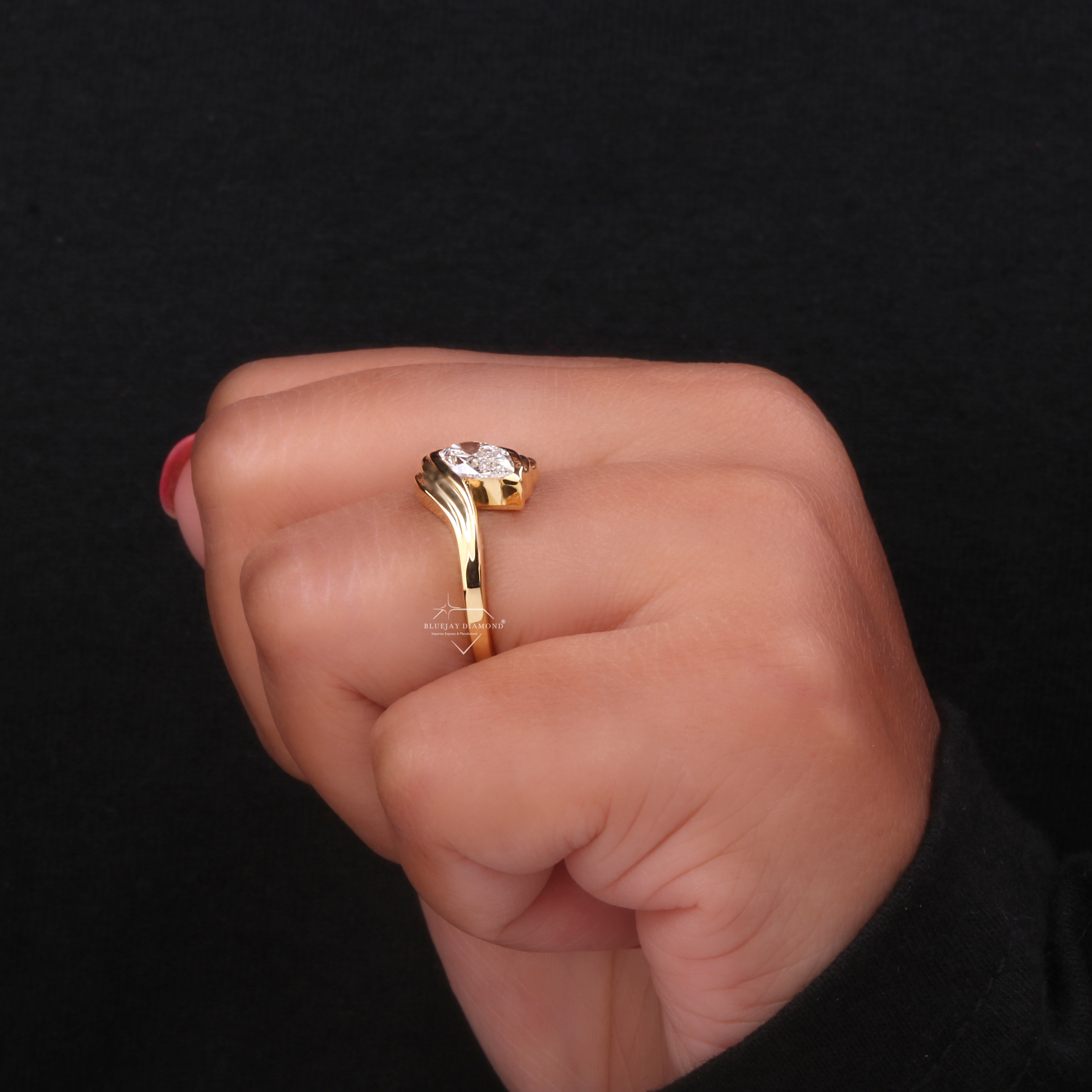 - Setting: The diamond is held securely in place by a prong setting that integrates seamlessly with the flowing band, enhancing its brilliance and unique shape.