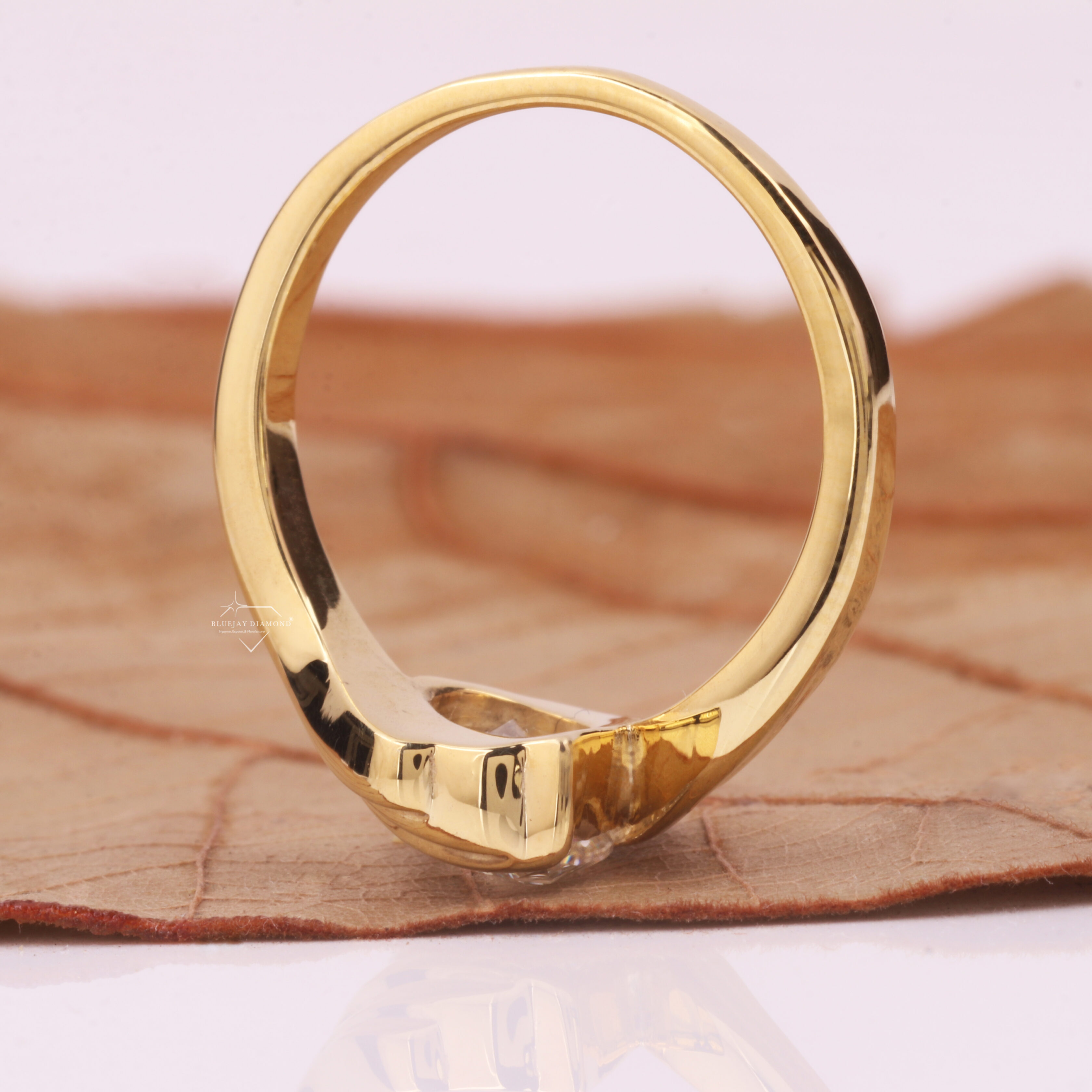 - Ring Design: The band is crafted from yellow gold and features a distinctive, sculptural wrap-around or wave-like design that cradles the diamond. The metalwork is domed and appears substantial.