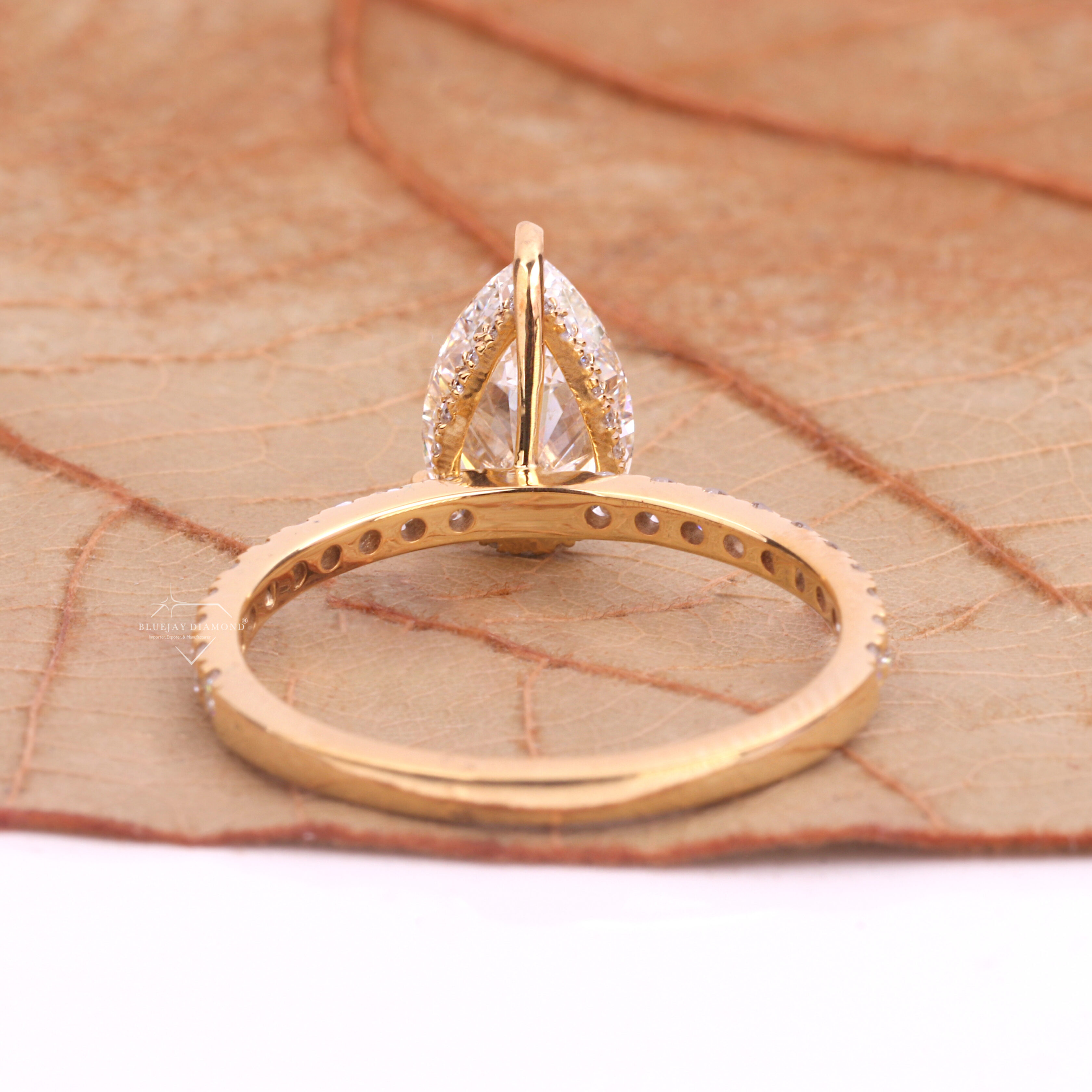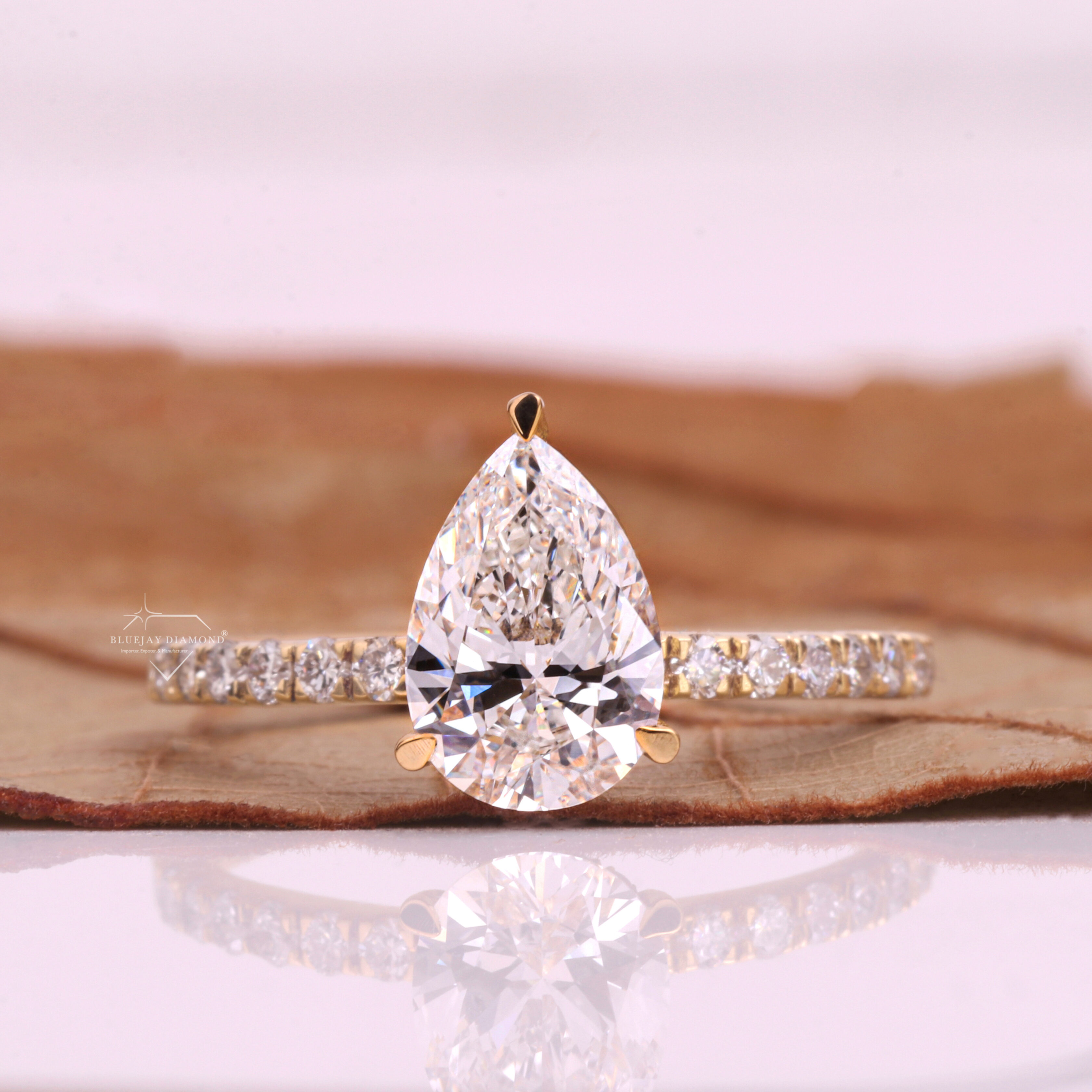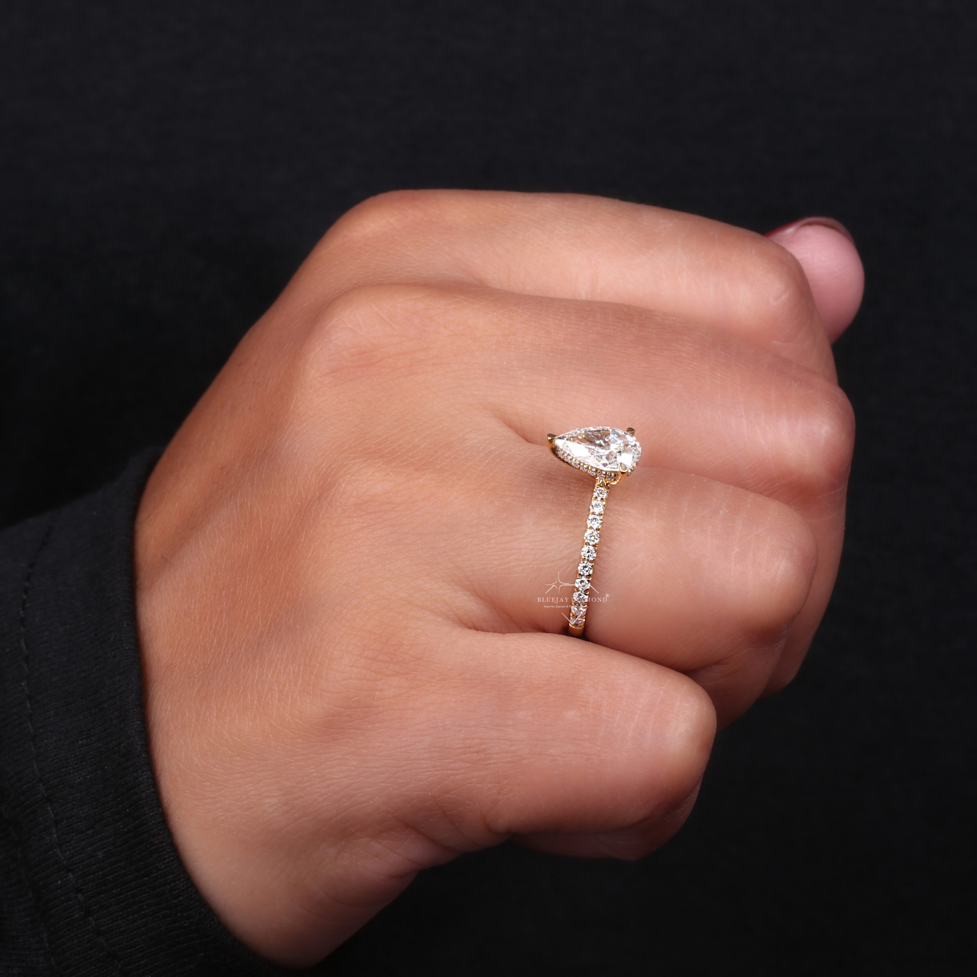 Diamond Shape – Pear-shaped (teardrop cut) diamond, combining the brilliance of a round cut with the elegance of a marquise cut.