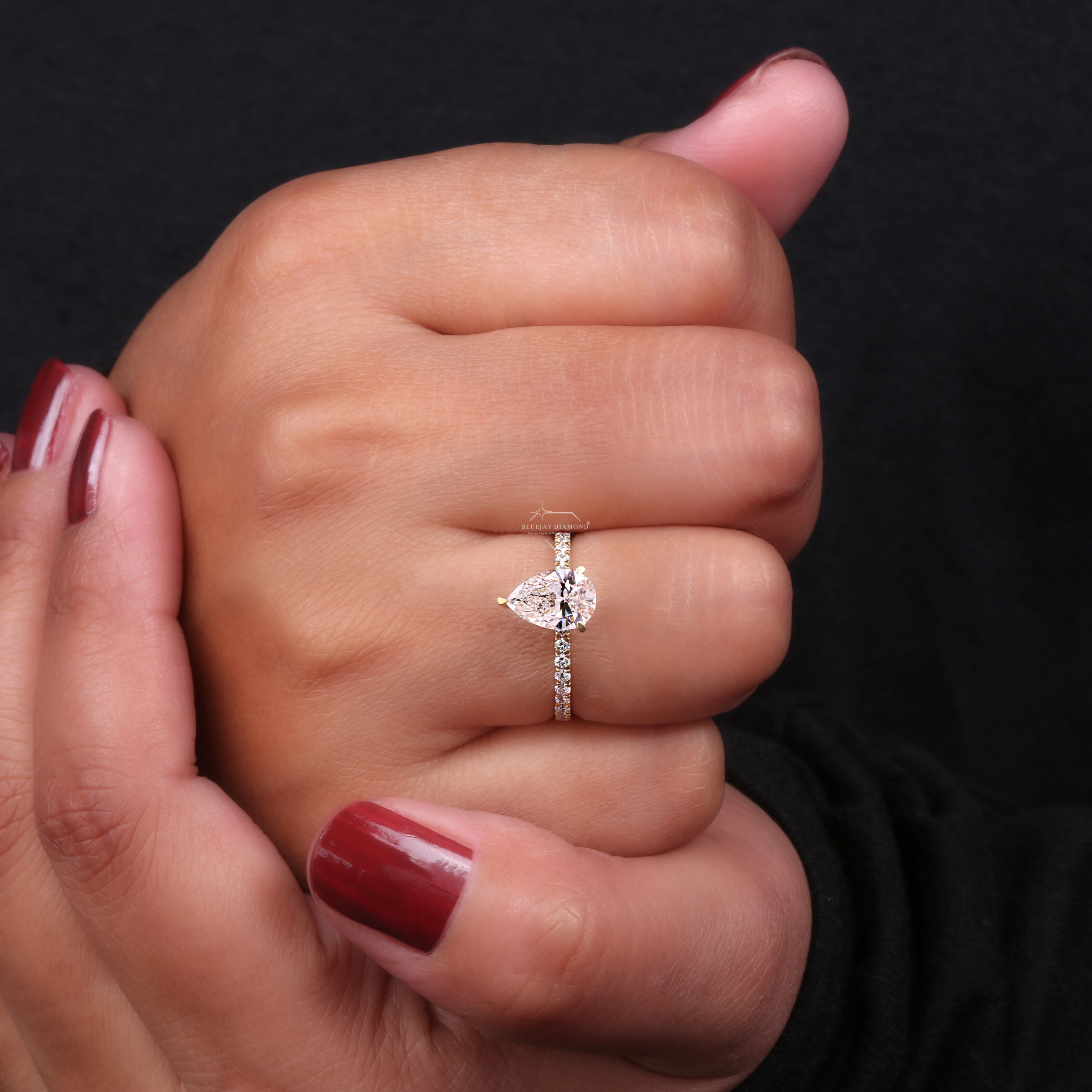 Design Style – Modern yet timeless, highlighting the center pear diamond as the focal point.