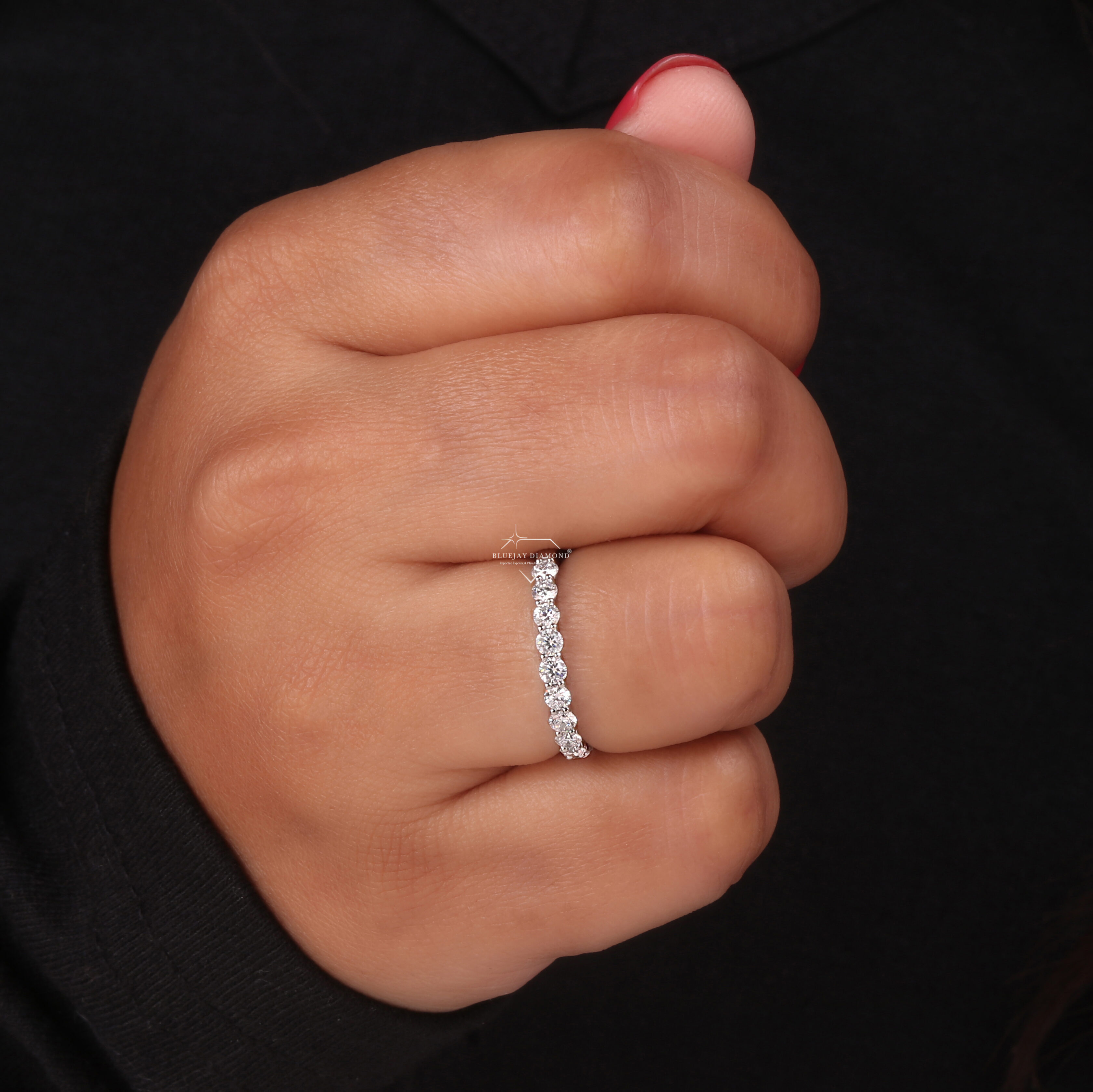 • Arrangement: The diamonds are consistently sized and set in a continuous, unbroken line around the circumference of the ring.