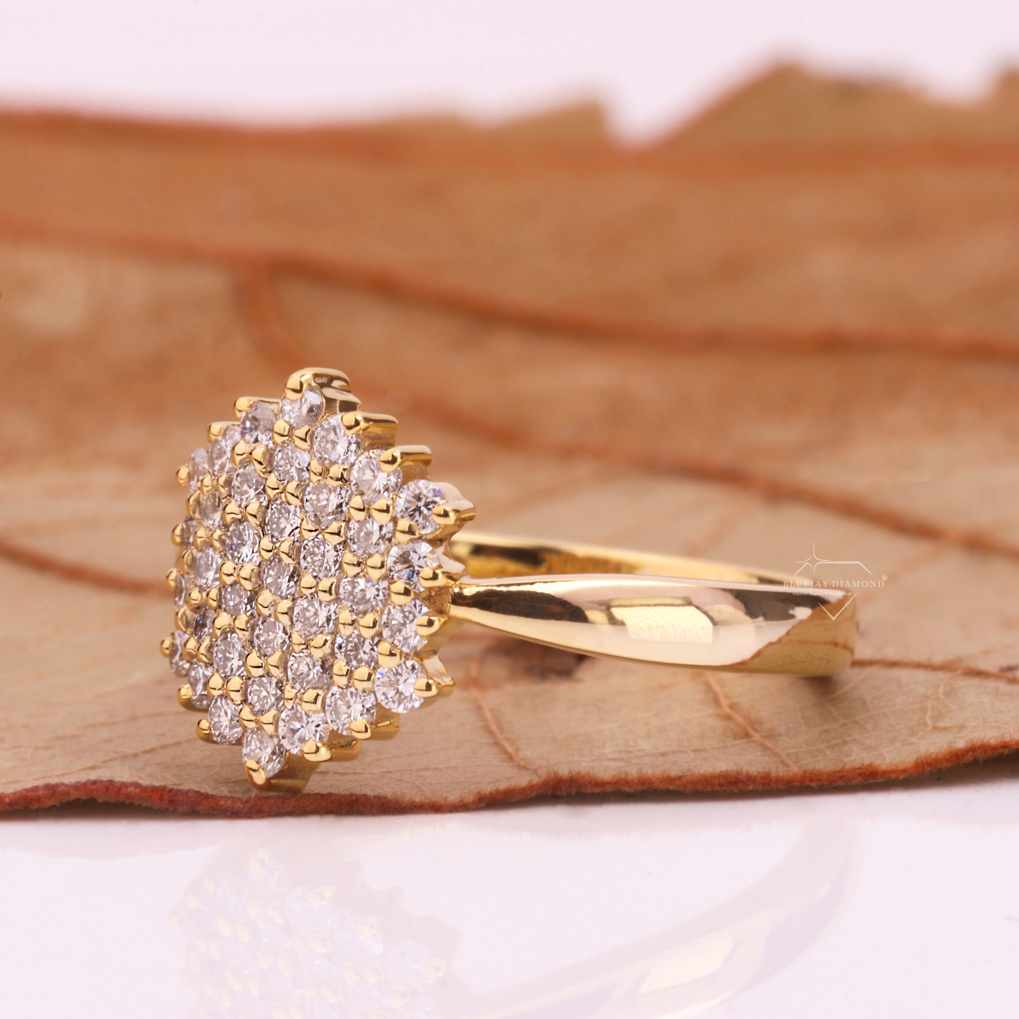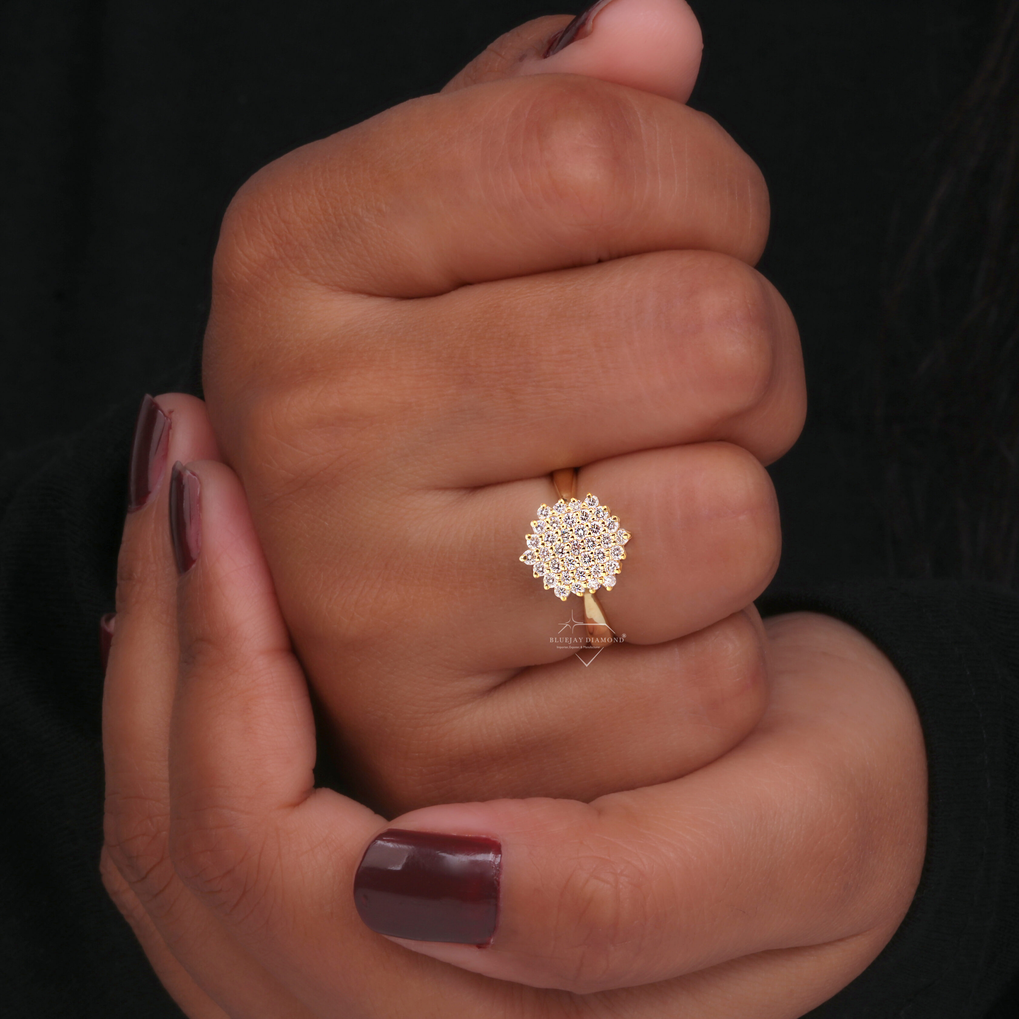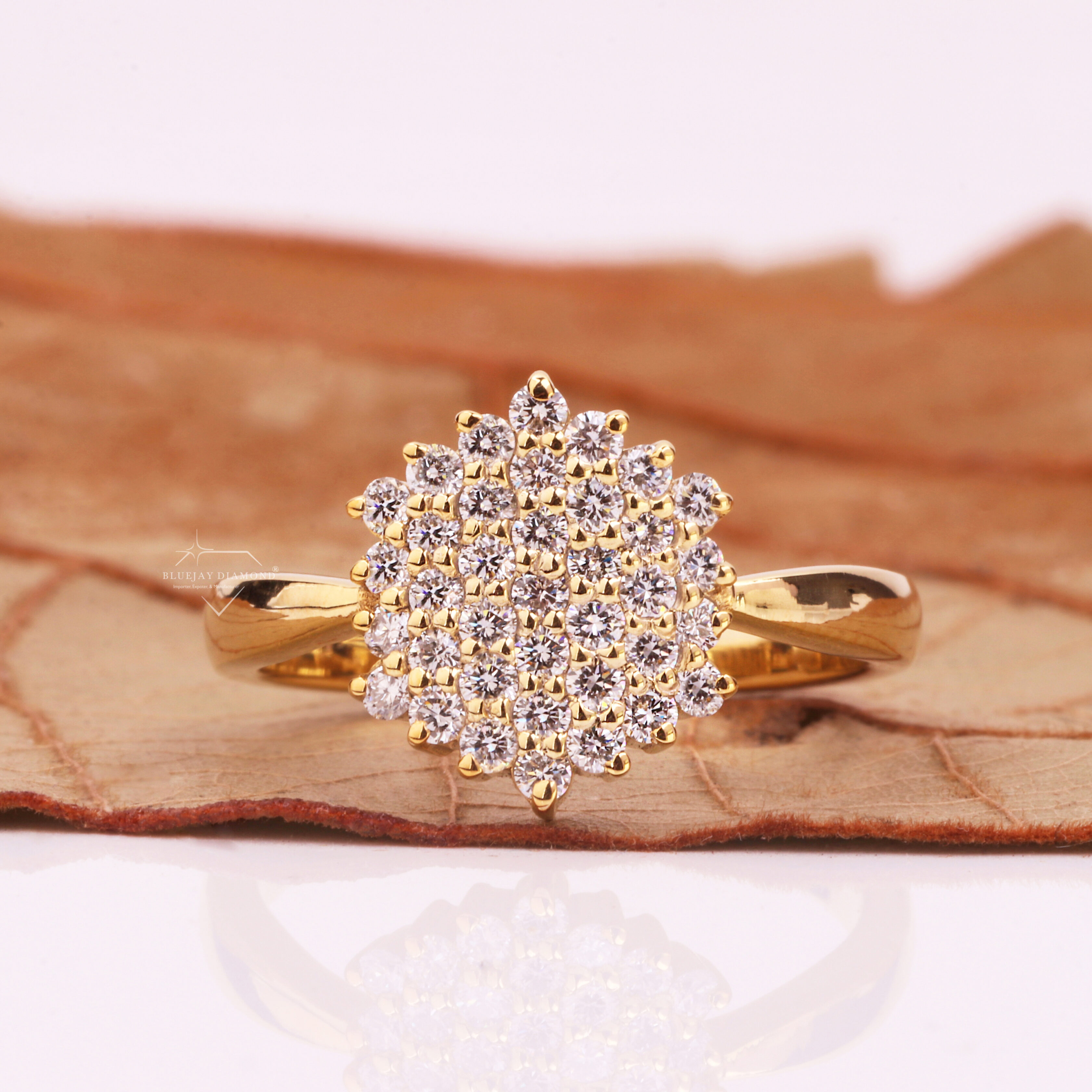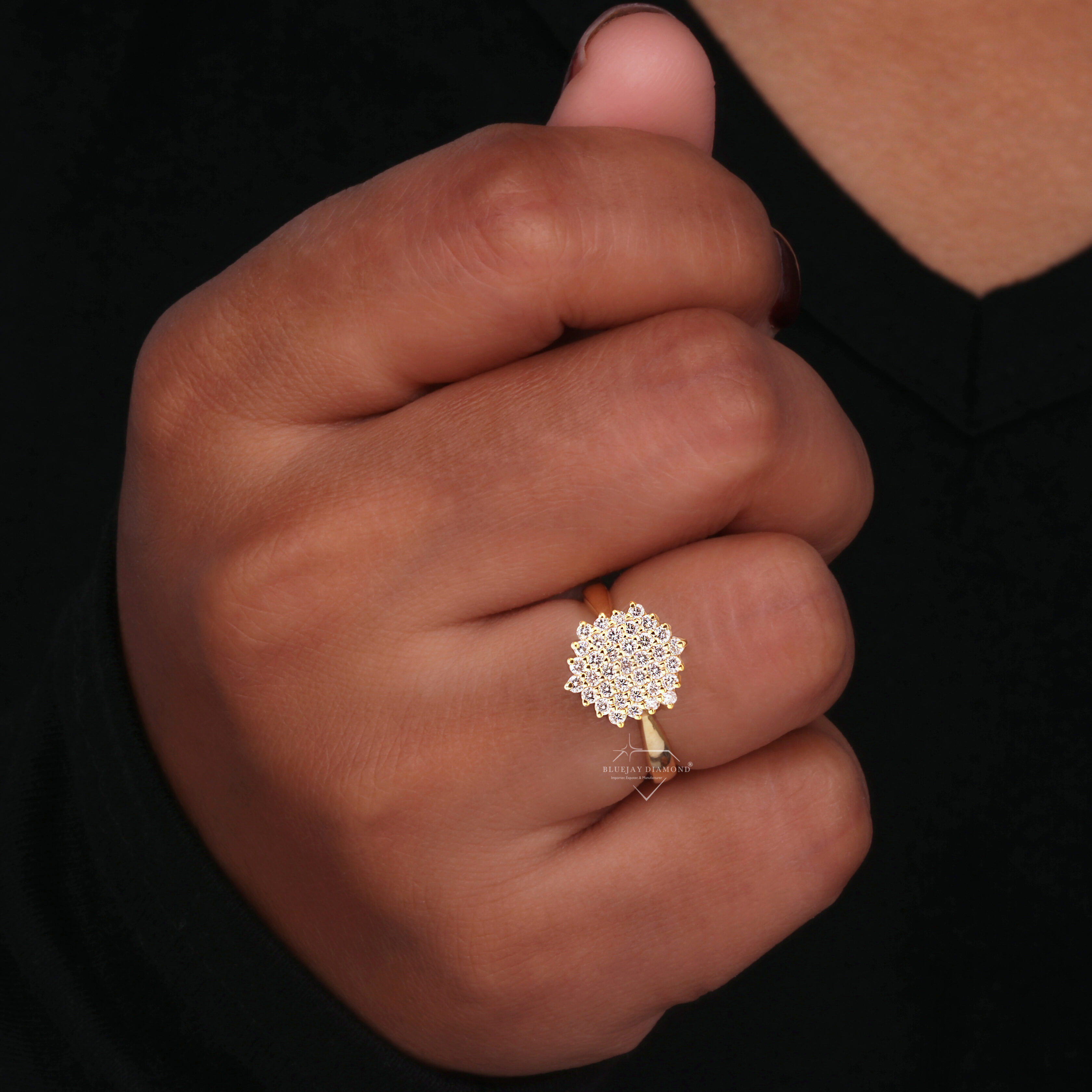 - Diamond Arrangement/Setting: The diamonds are arranged in a cluster setting, meticulously placed together to create a larger, unified appearance. This specific cluster forms a prominent floral or snowflake-like pattern in the center of the ring, giving it a natural and elegant aesthetic.