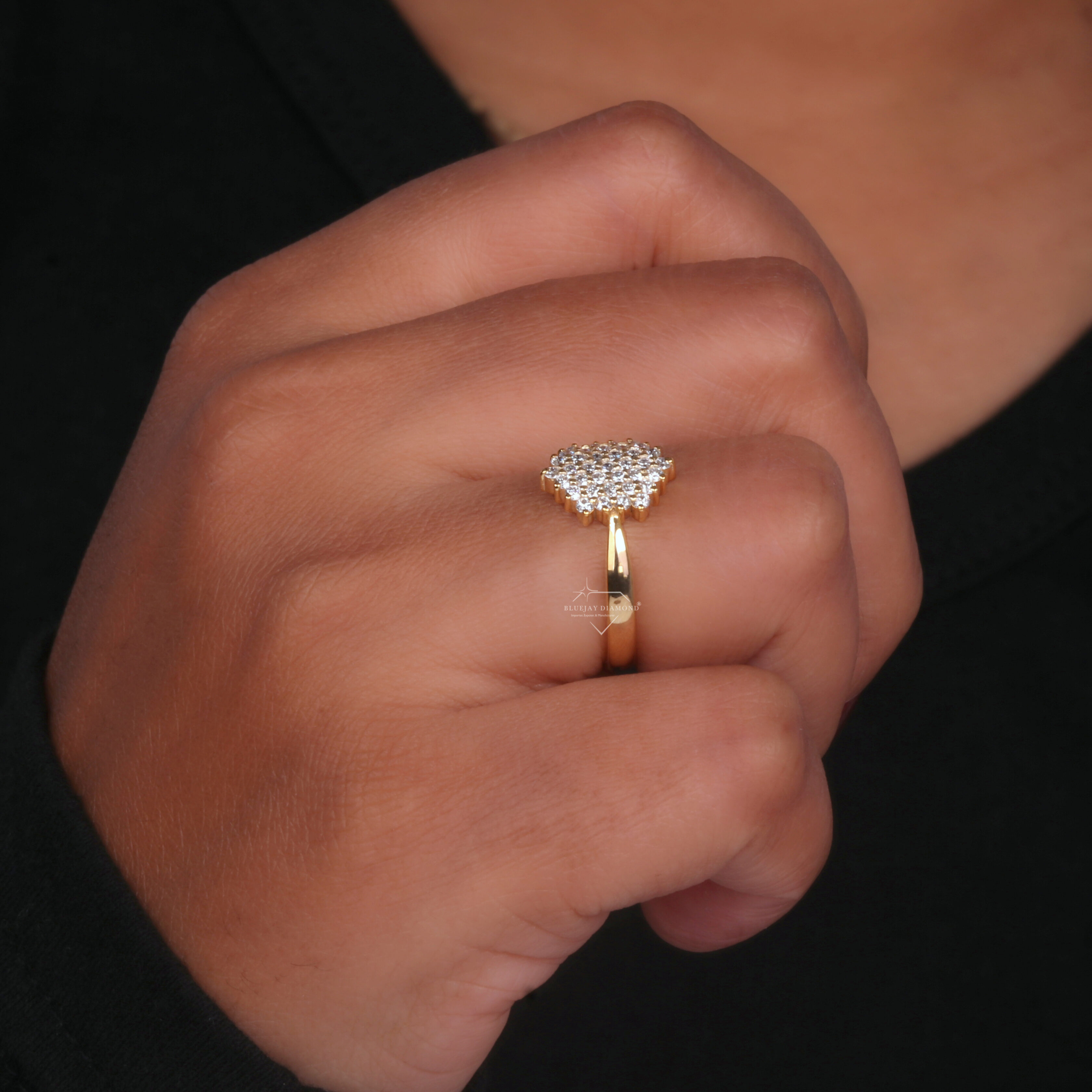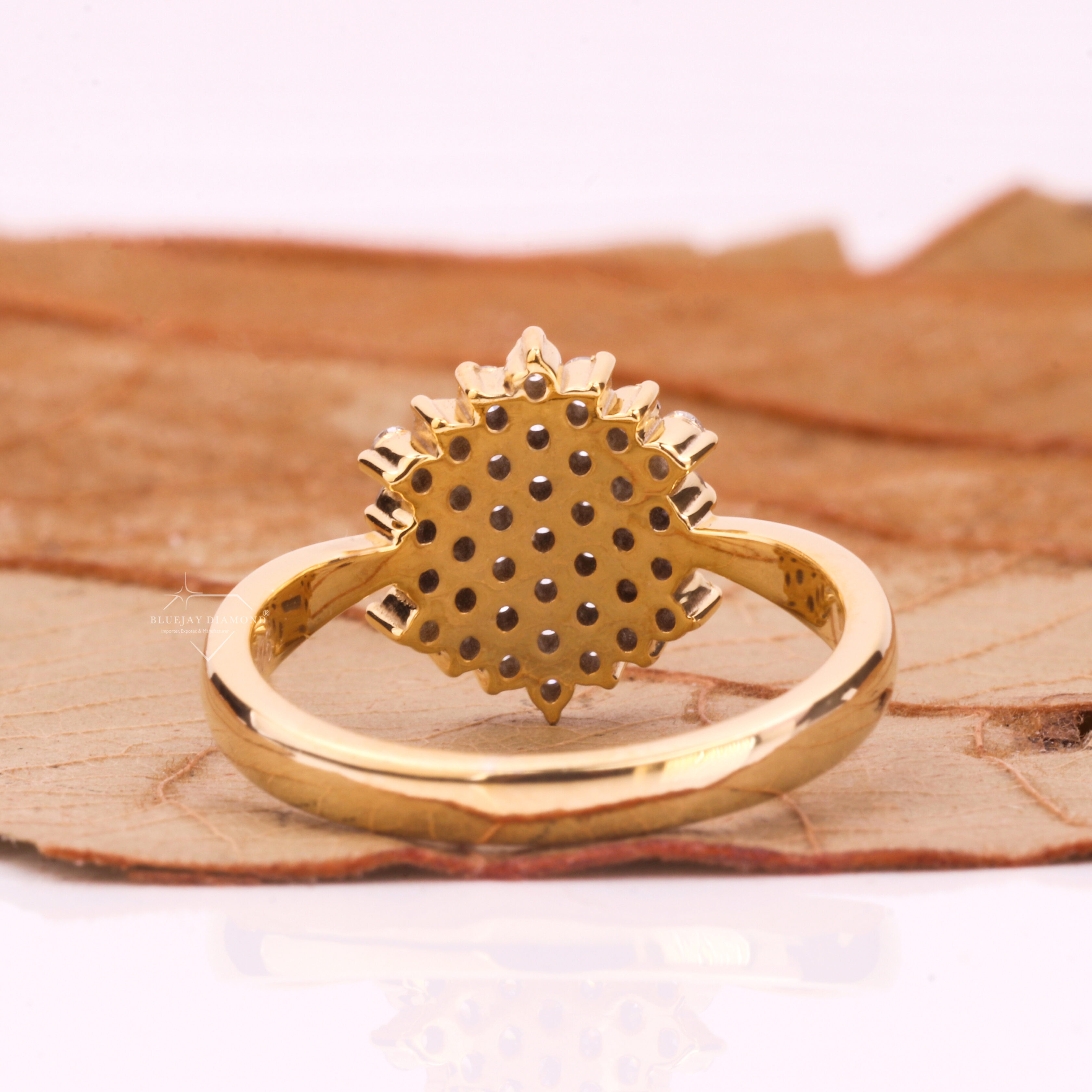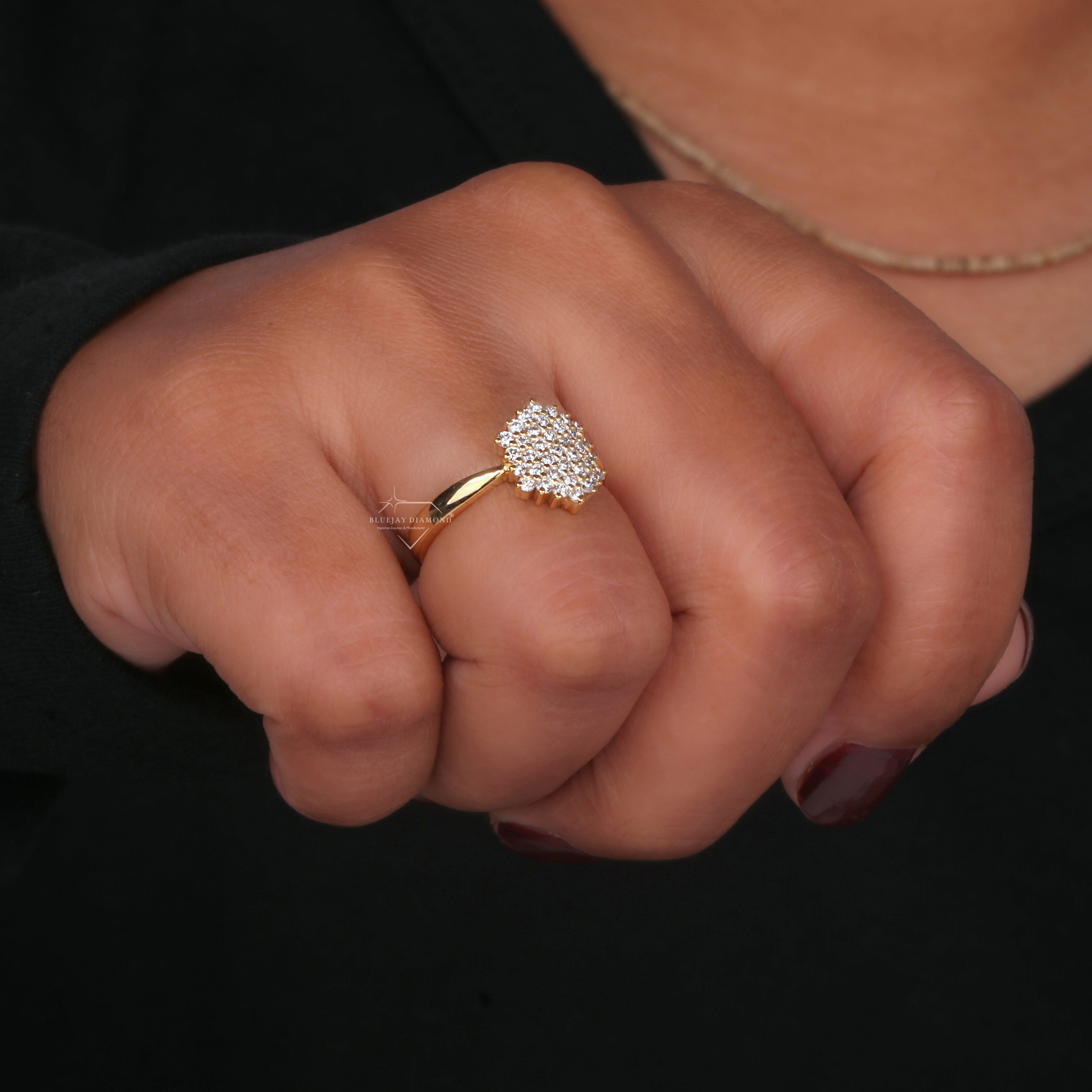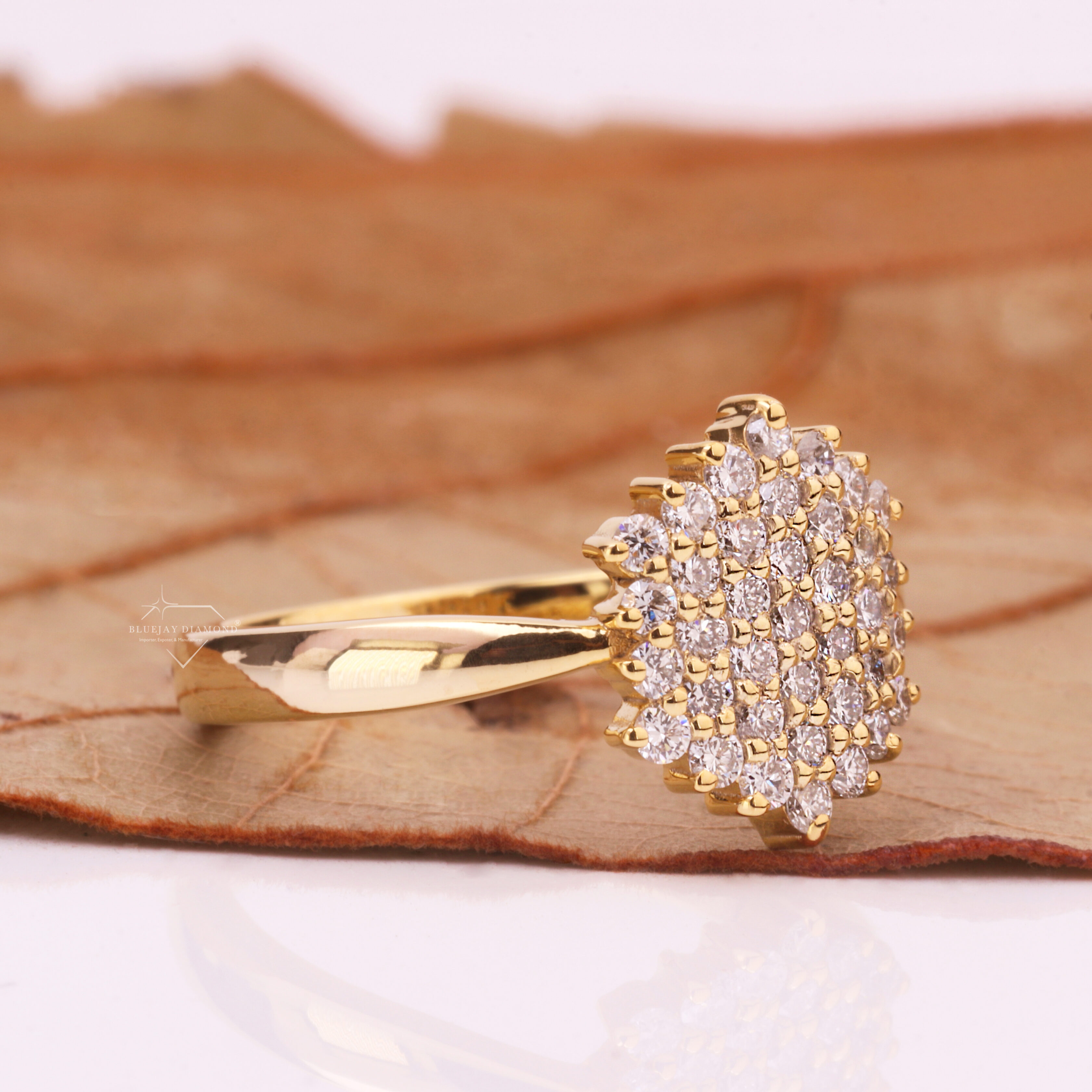 - Diamond Arrangement/Setting: The diamonds are arranged in a cluster setting, meticulously placed together to create a larger, unified appearance. This specific cluster forms a prominent floral or snowflake-like pattern in the center of the ring, giving it a natural and elegant aesthetic.