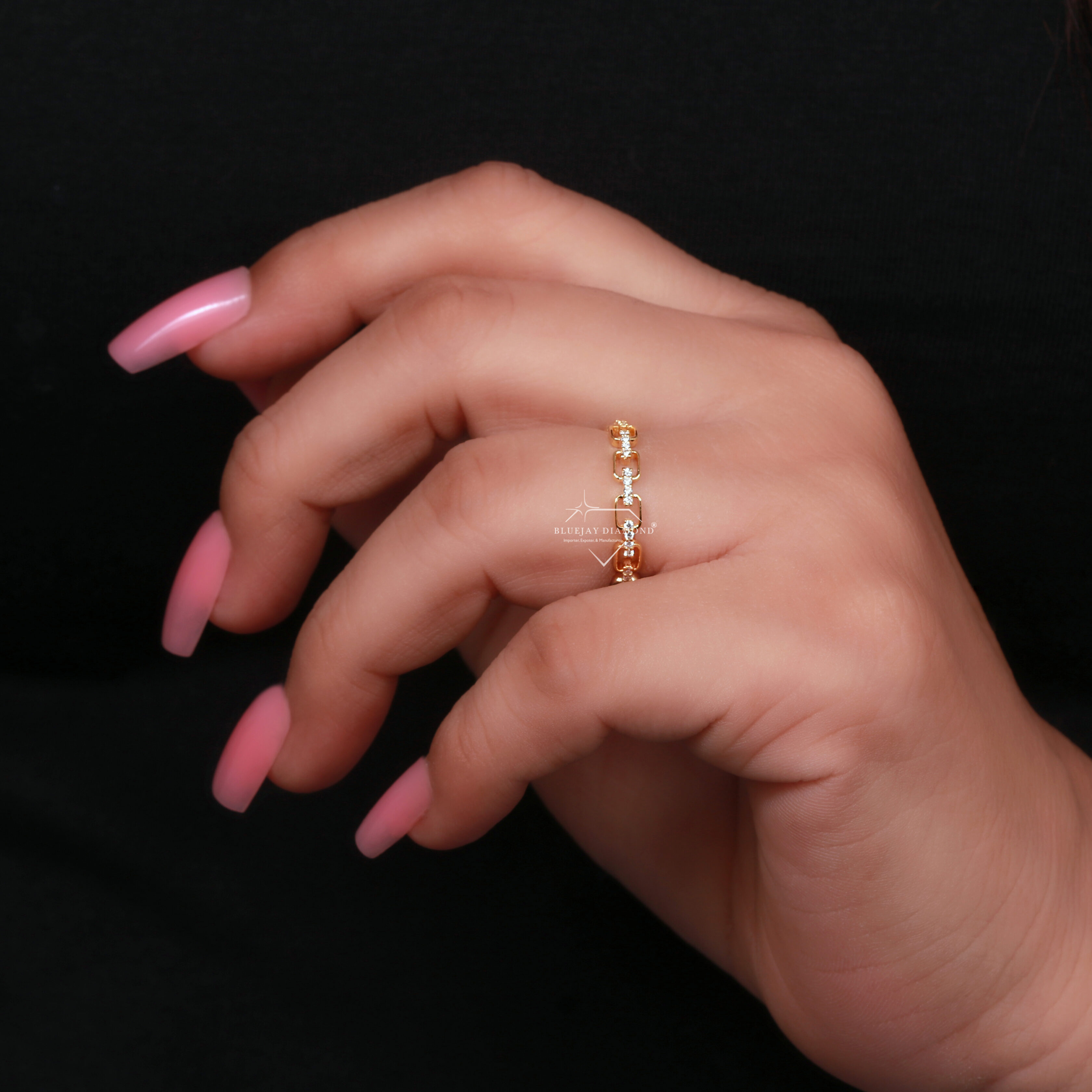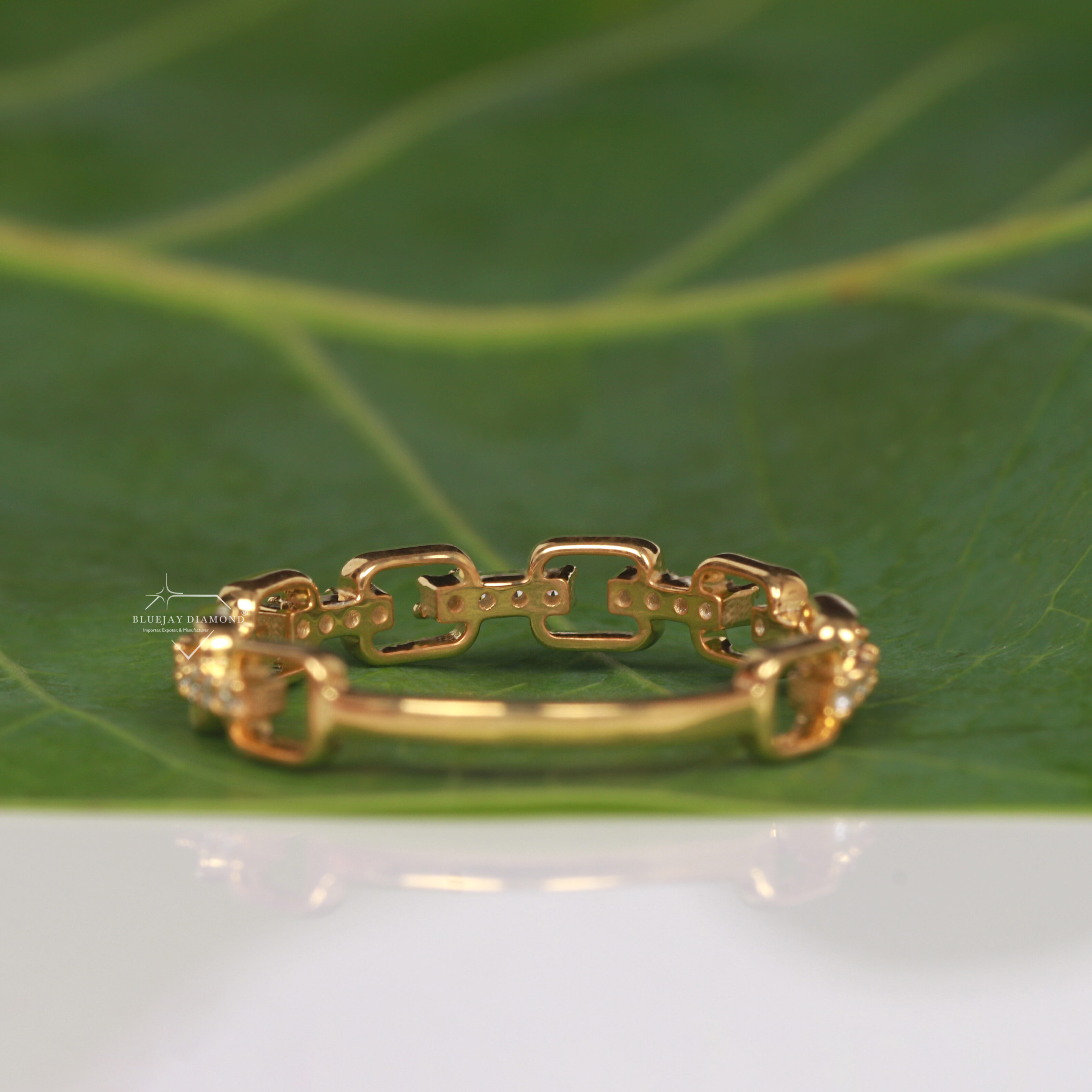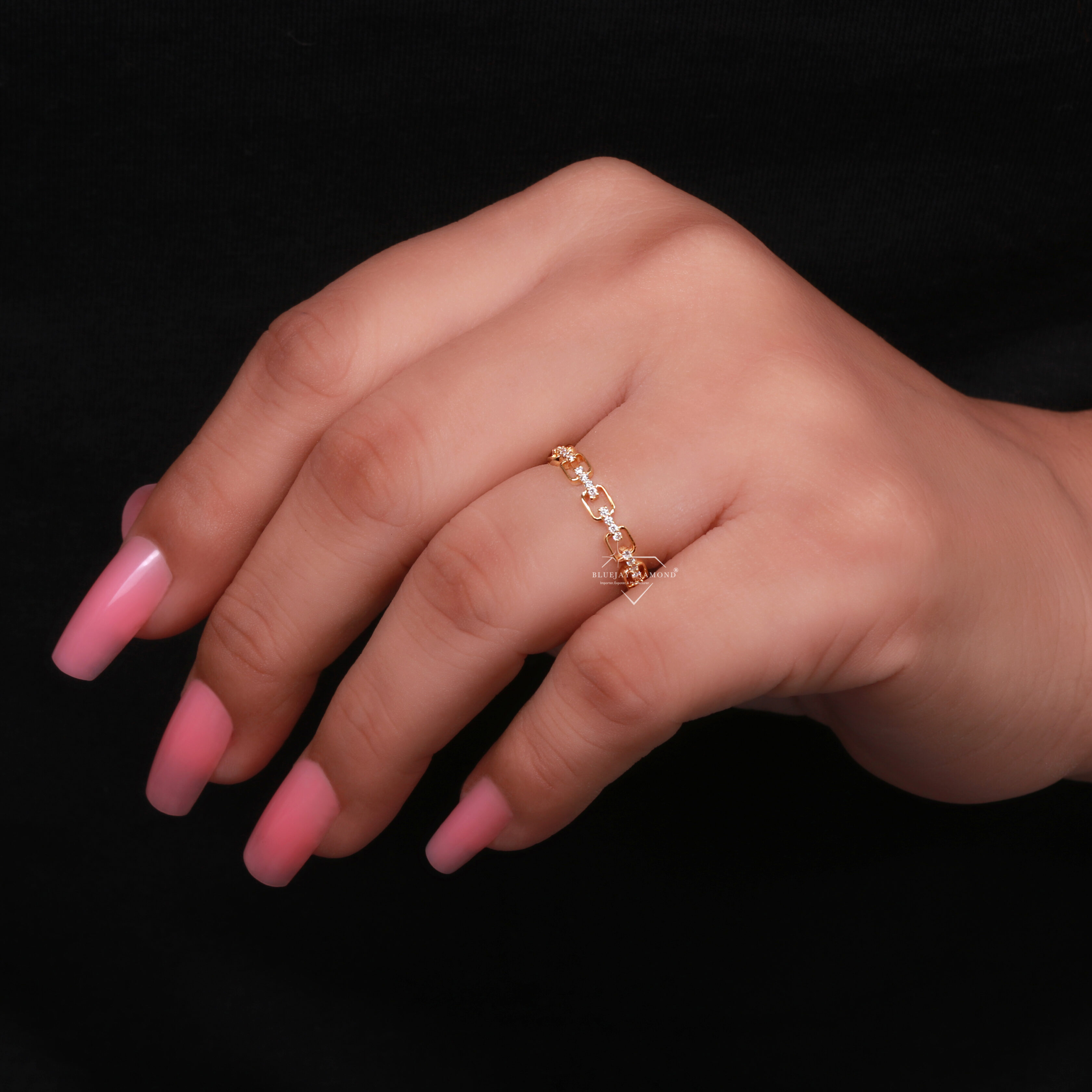 - Overall Design: The ring is a band-style ring where the metal is formed into a series of interconnected, open-work chain links, creating a bold yet refined look.
