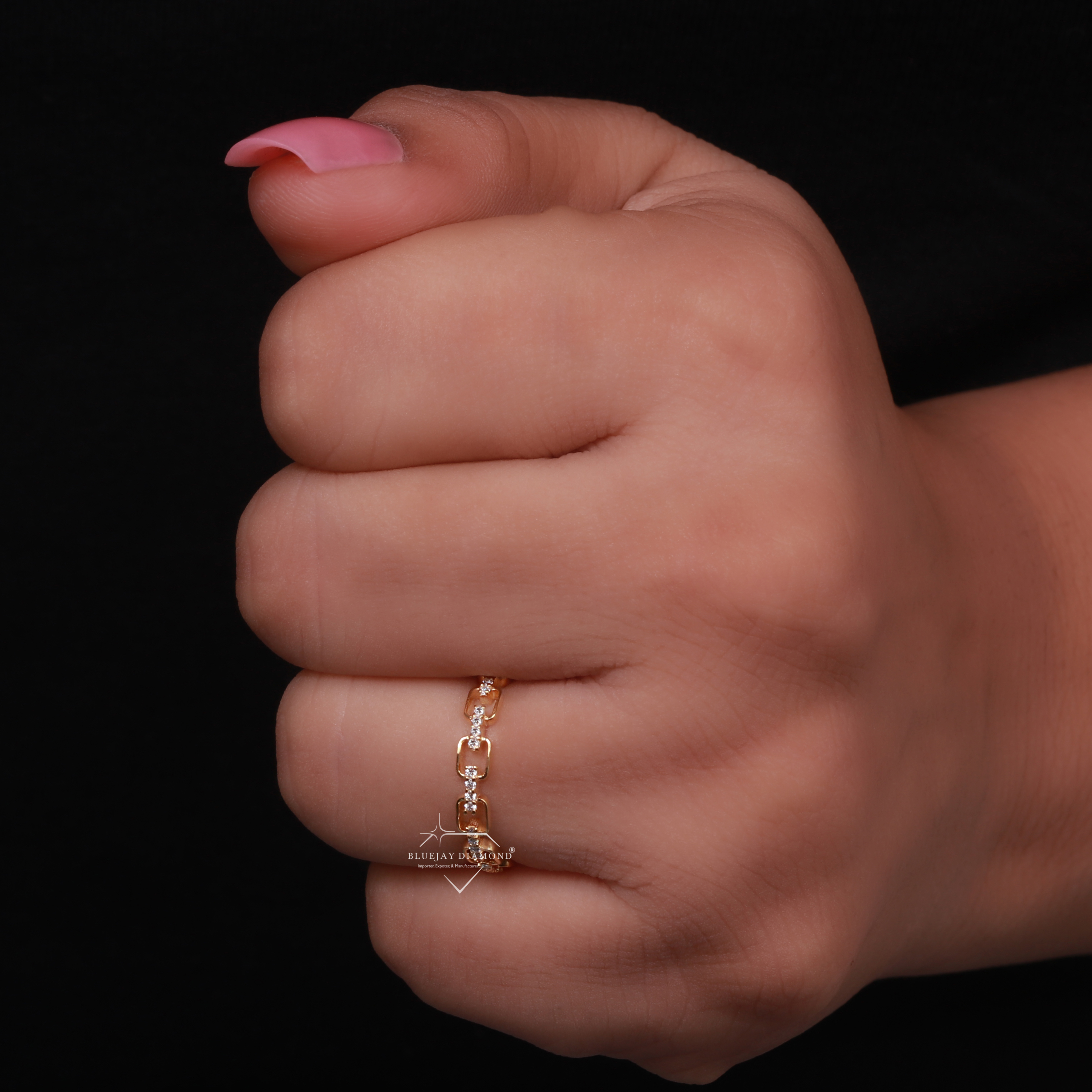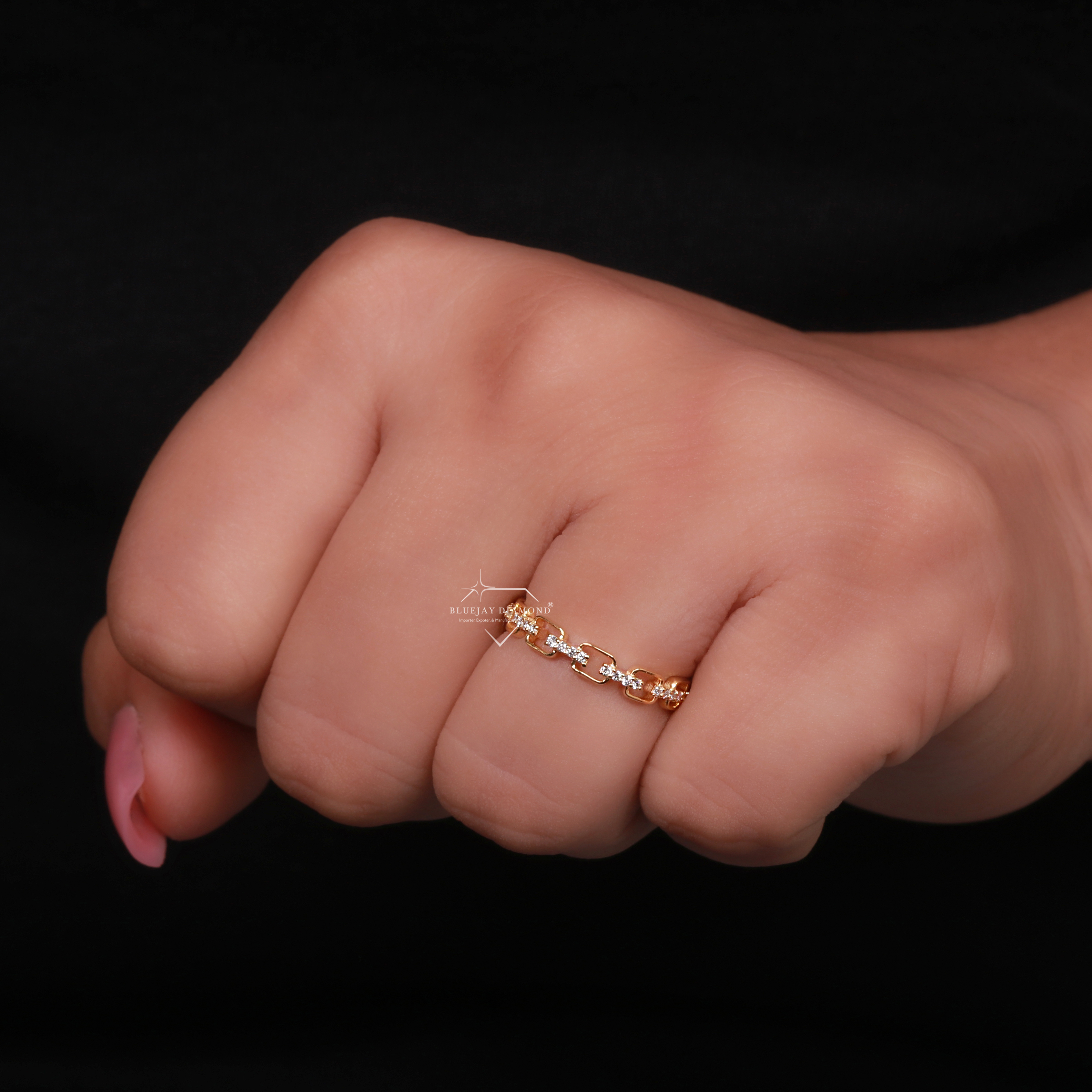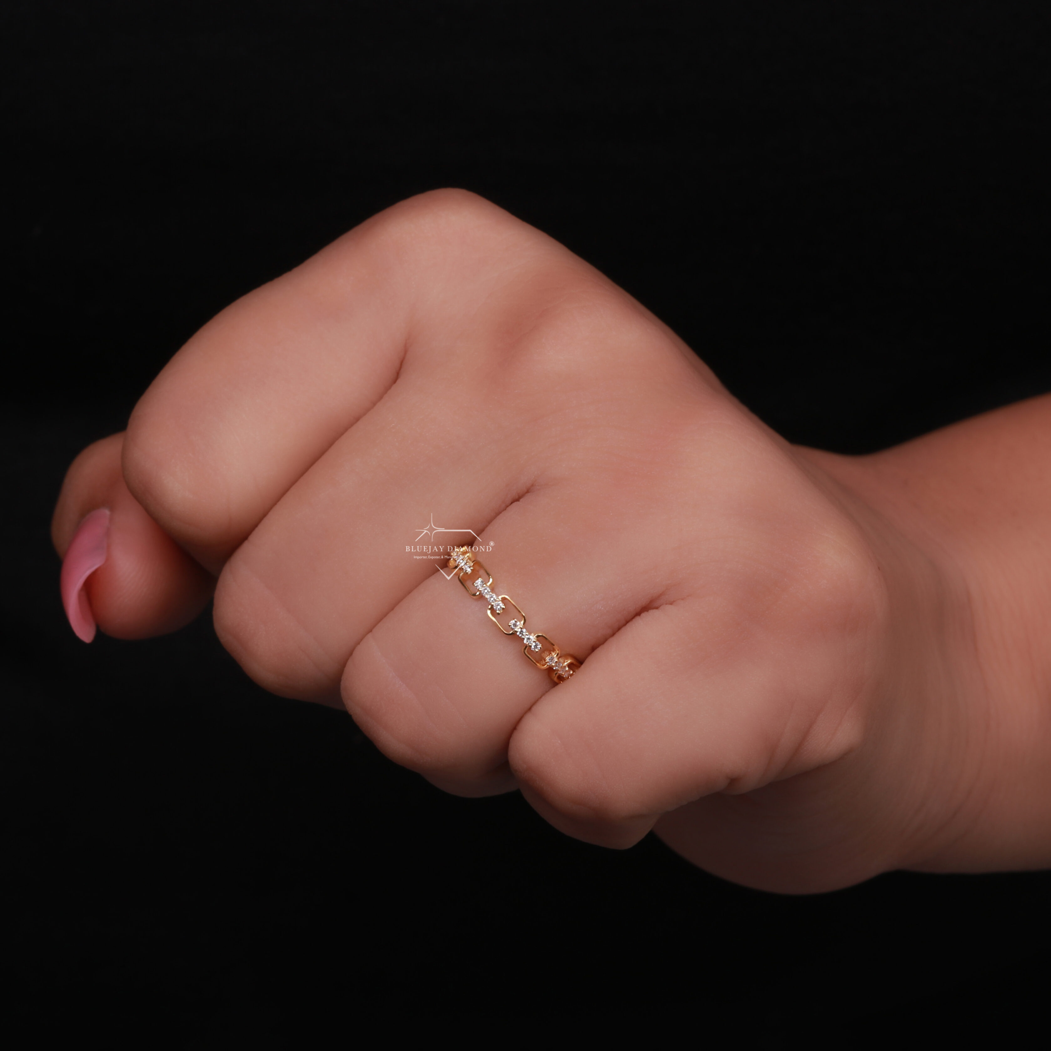 - Overall Design: The ring is a band-style ring where the metal is formed into a series of interconnected, open-work chain links, creating a bold yet refined look.