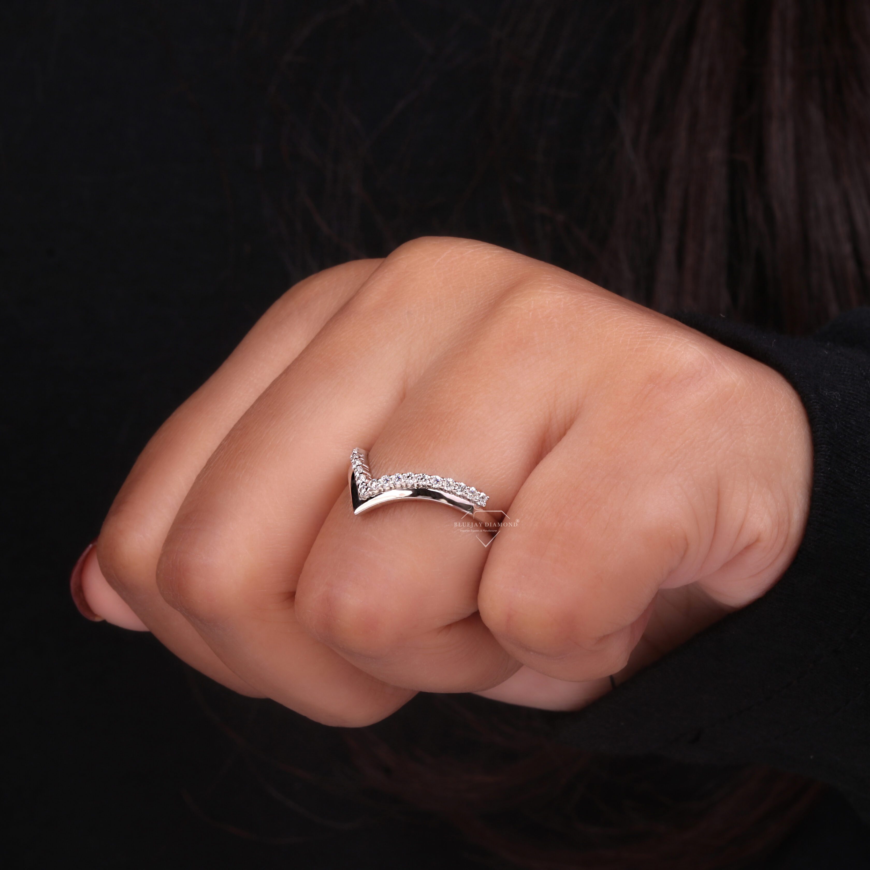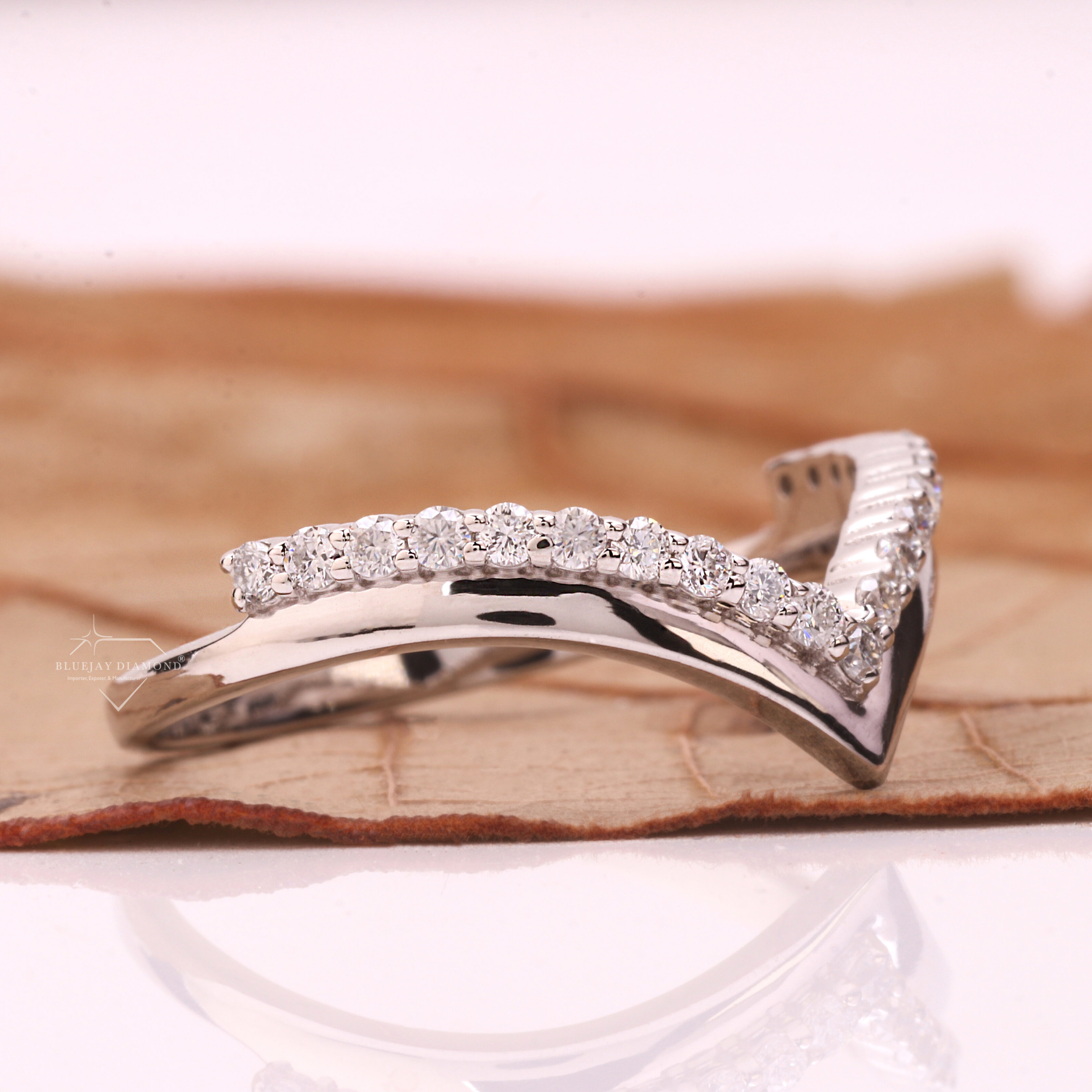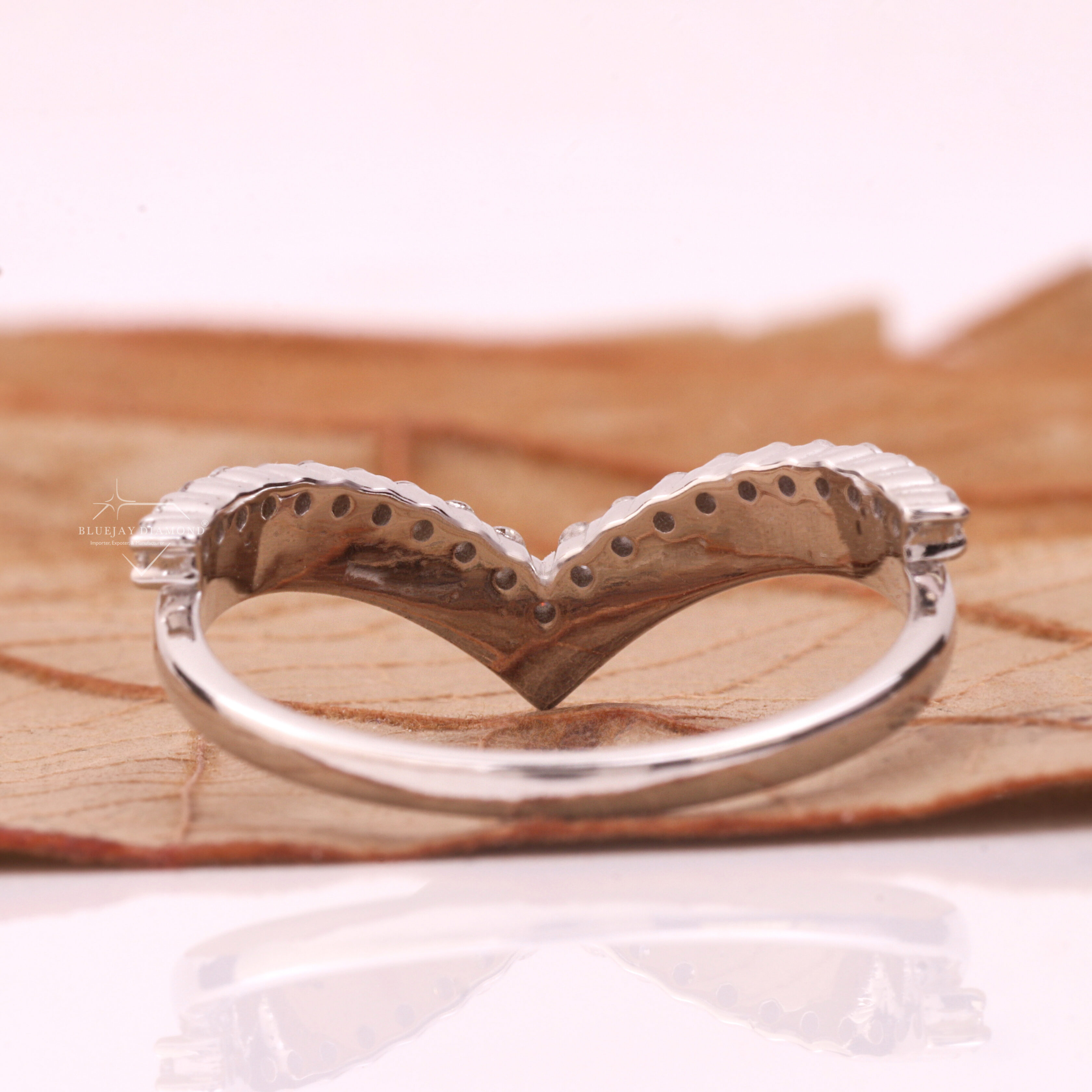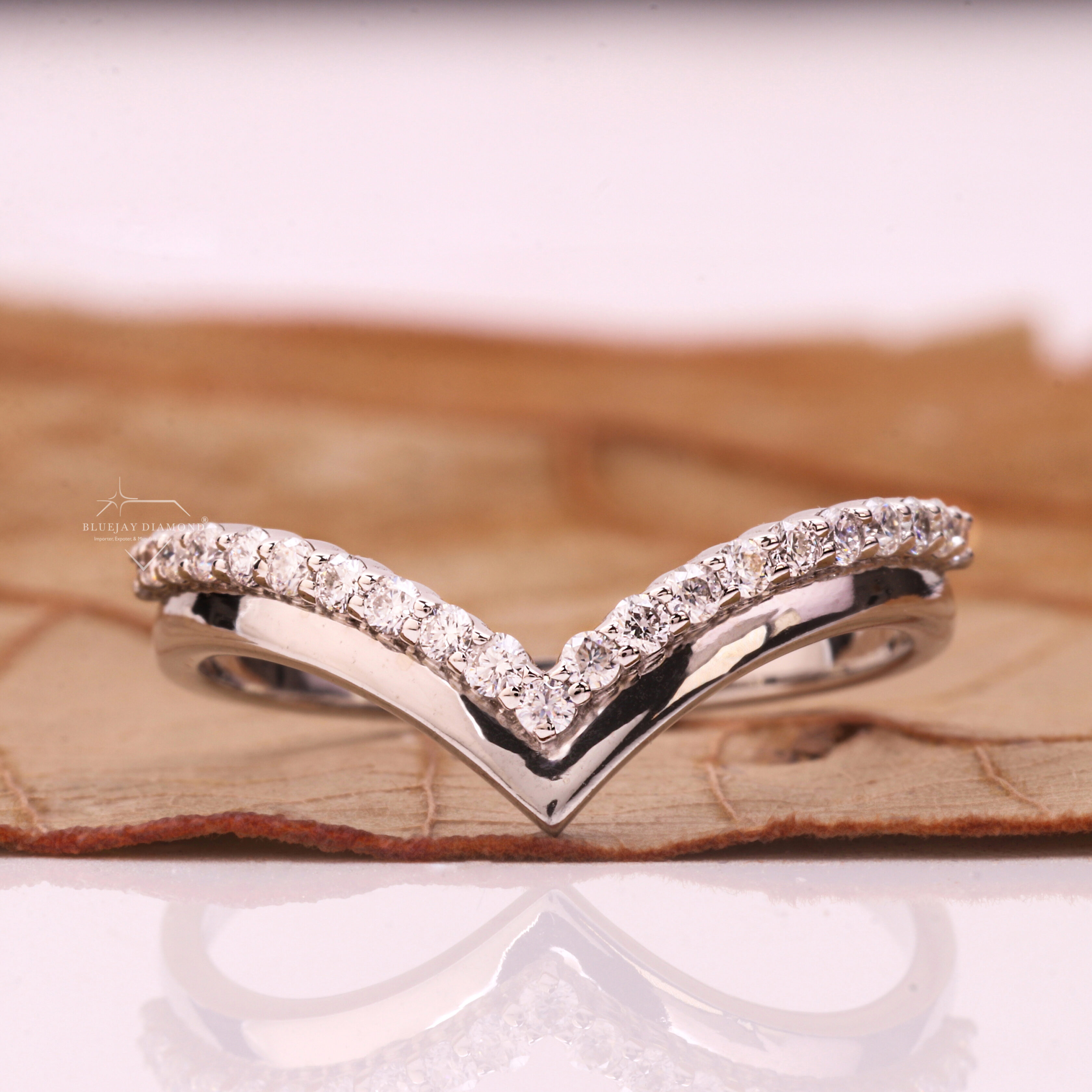- Ring Design: The ring has a distinctive V-shape, also known as a chevron or wishbone design. This angular shape is designed to fit well with a prominent engagement ring setting, allowing for a stackable look.