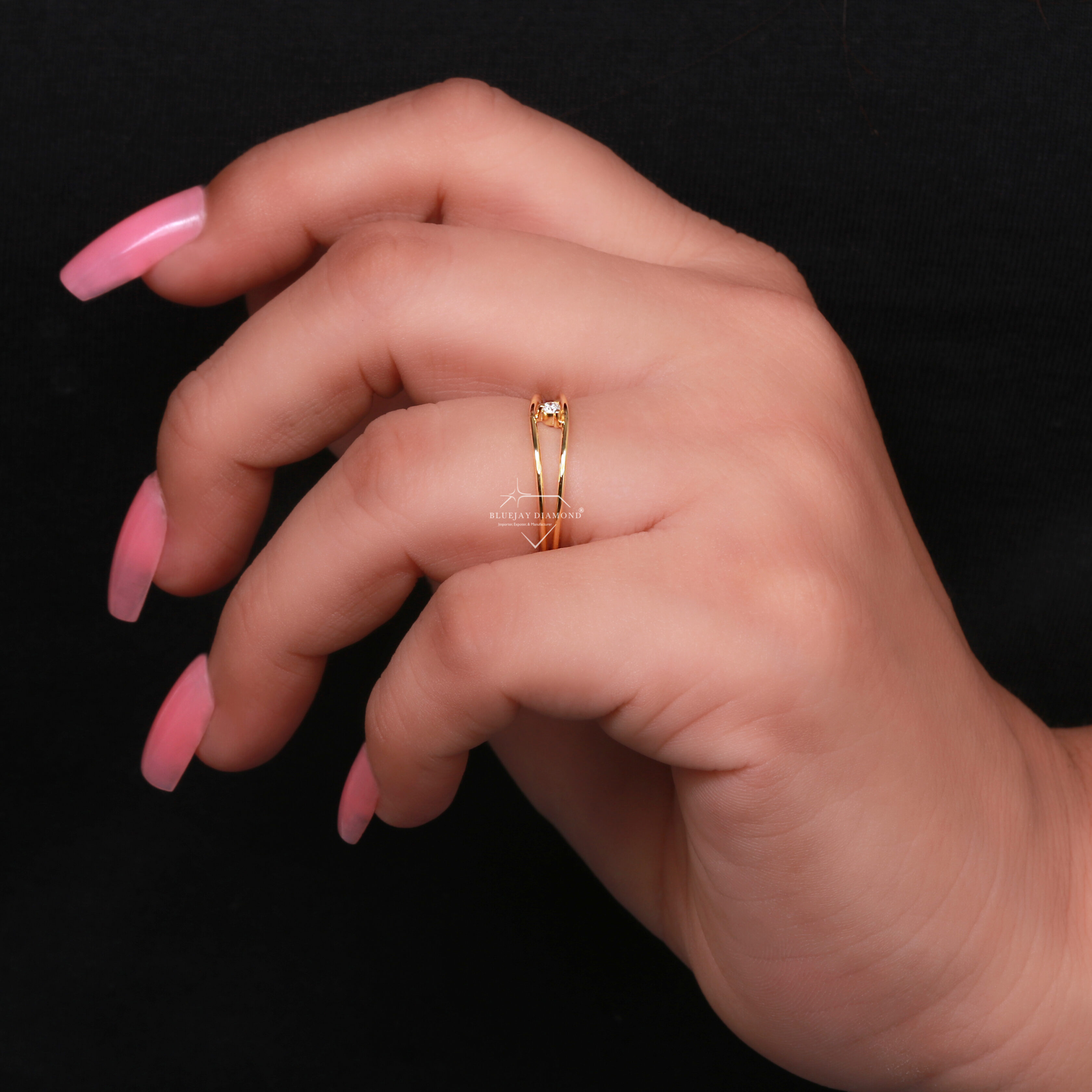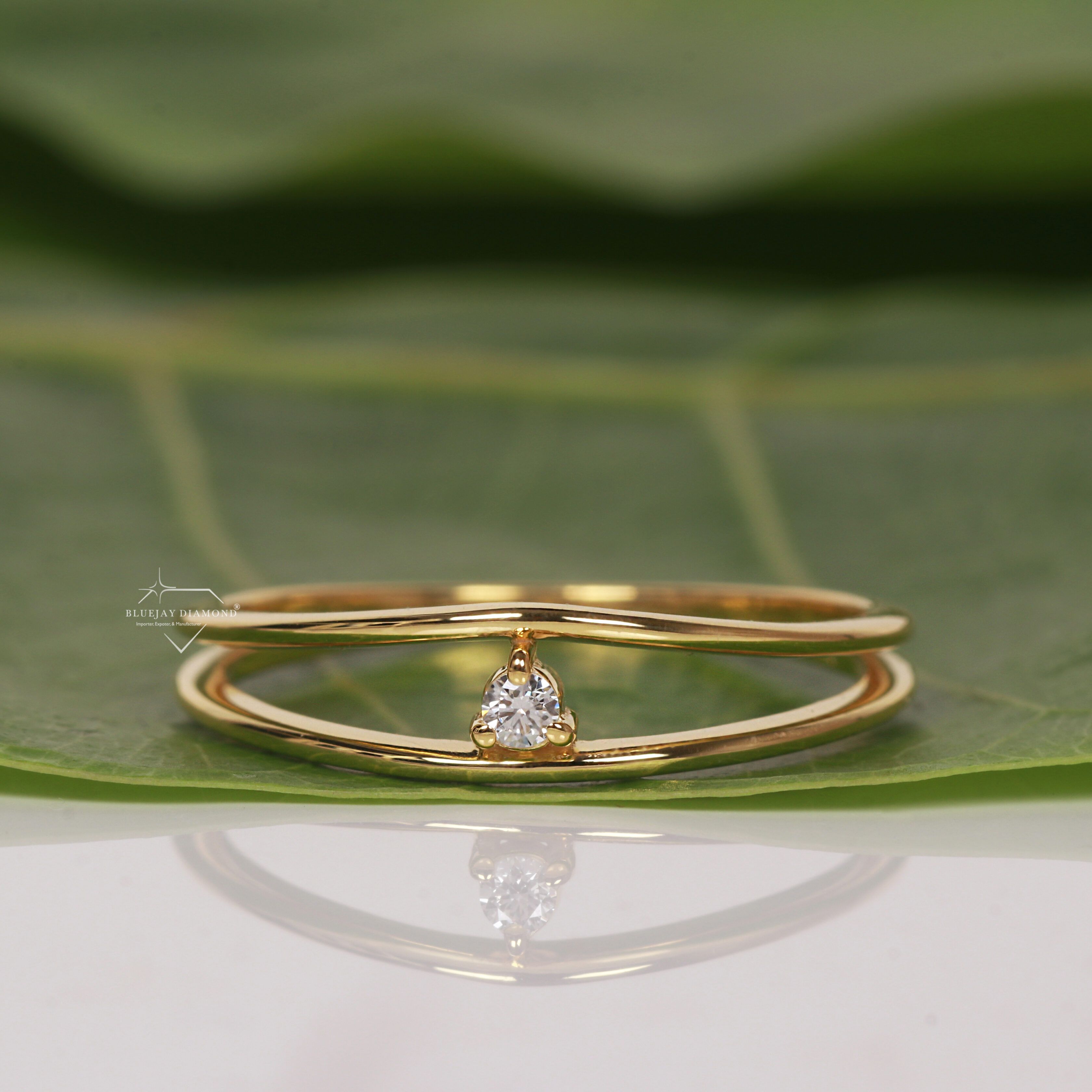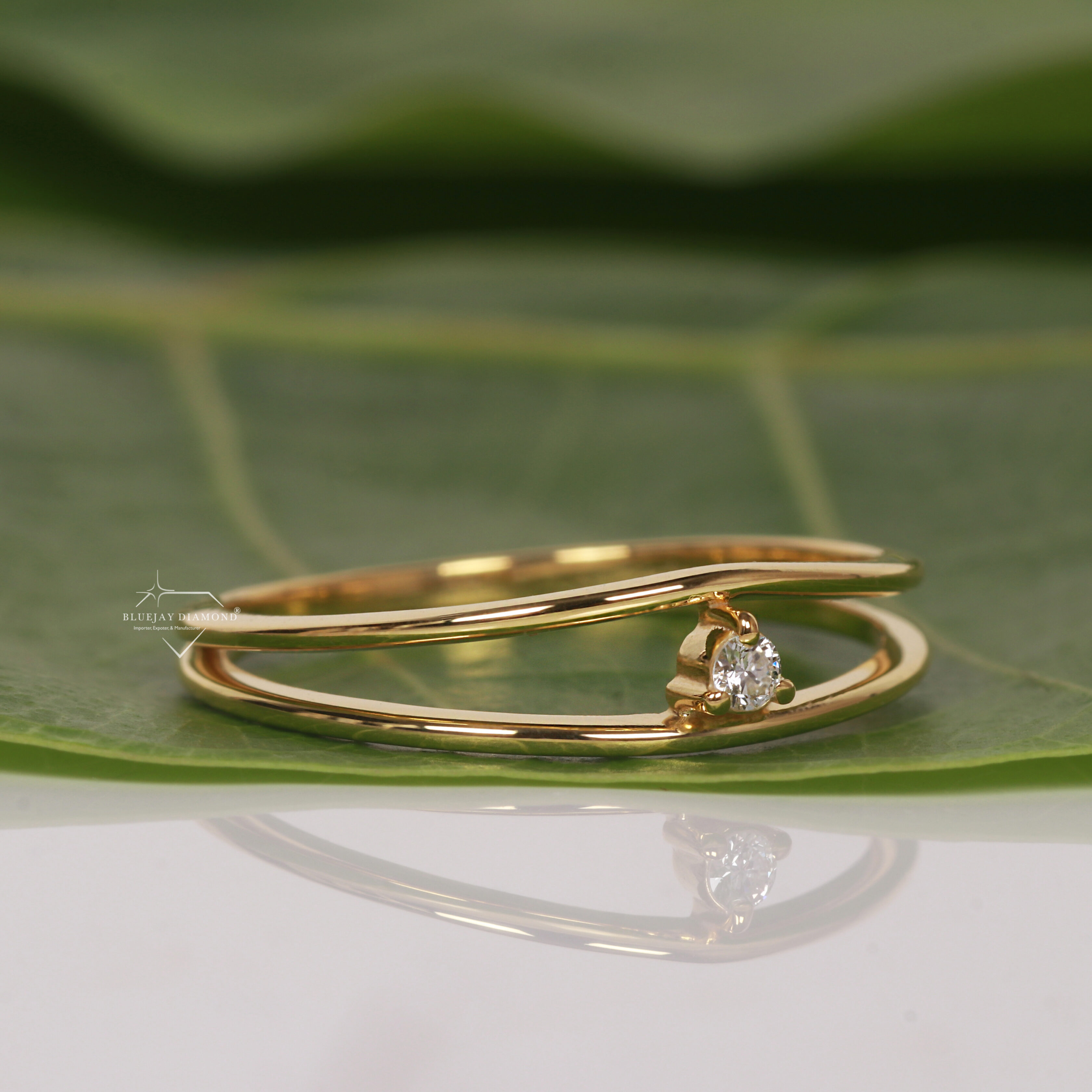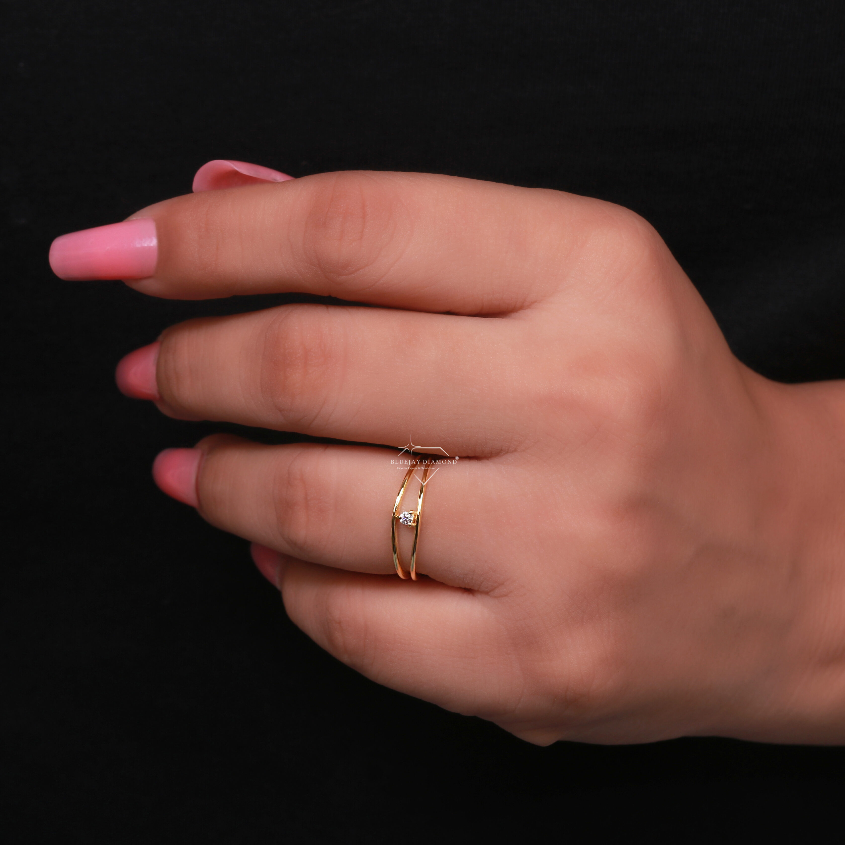 - Bands: The design consists of two slender, parallel gold bands that curve around the finger, with the single diamond set at the point where they cross over. This style is often referred to as a “parallel bands” or “dual band” ring.