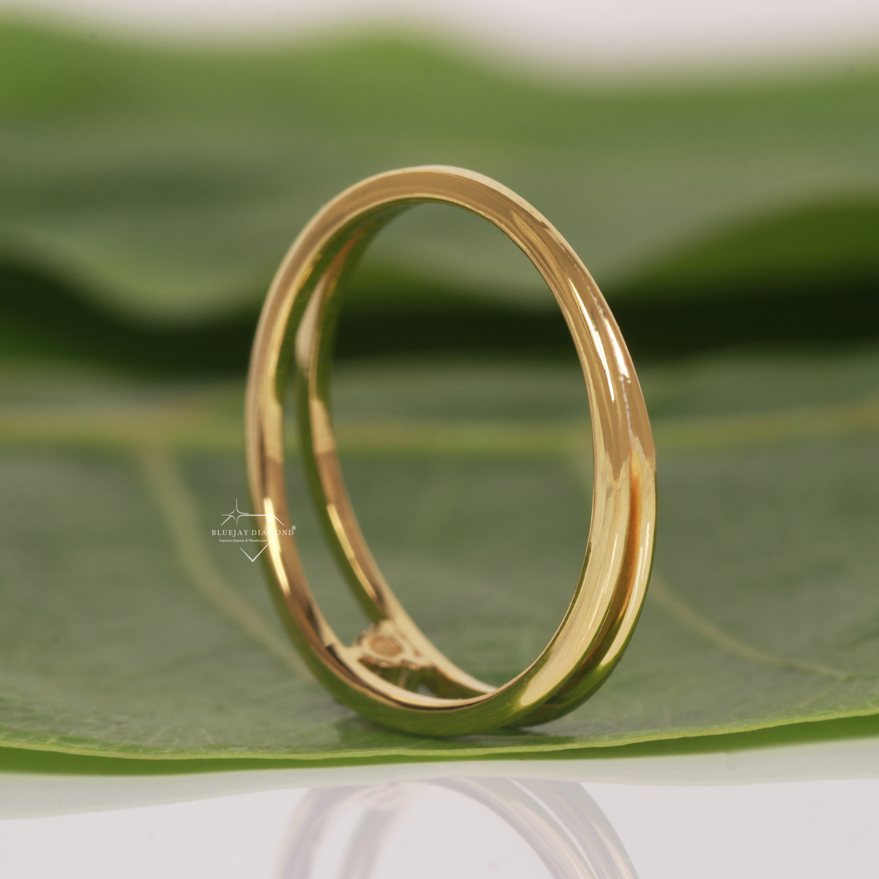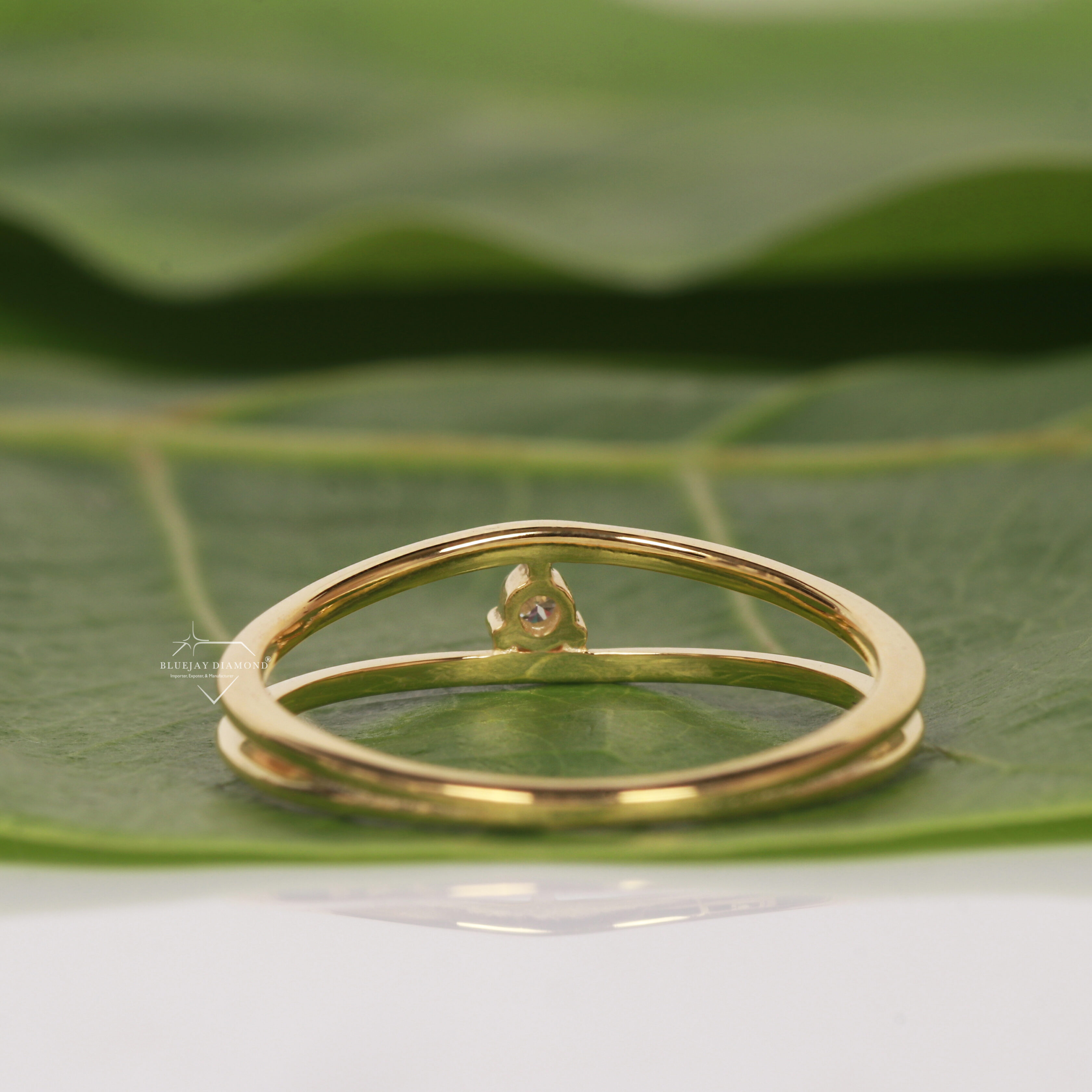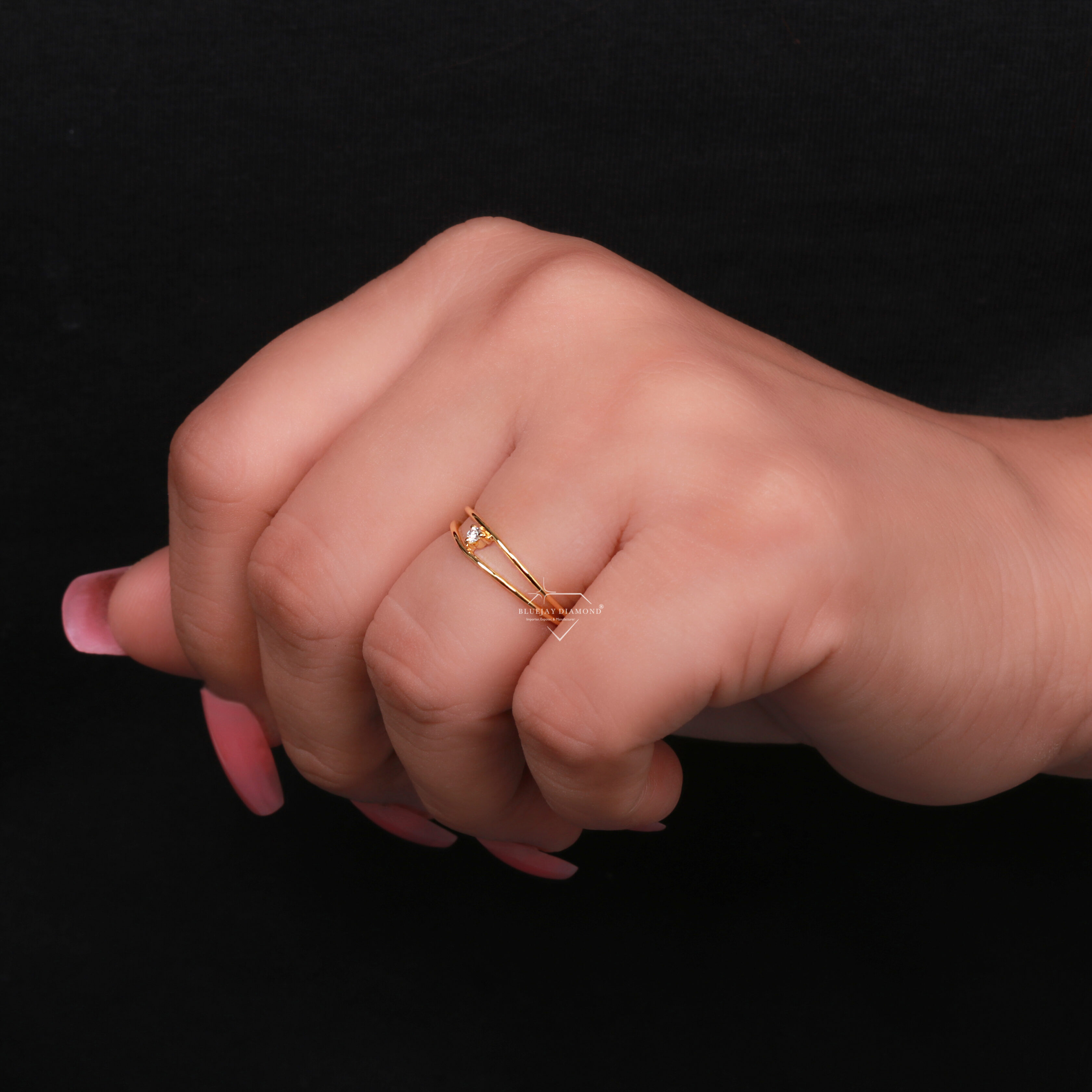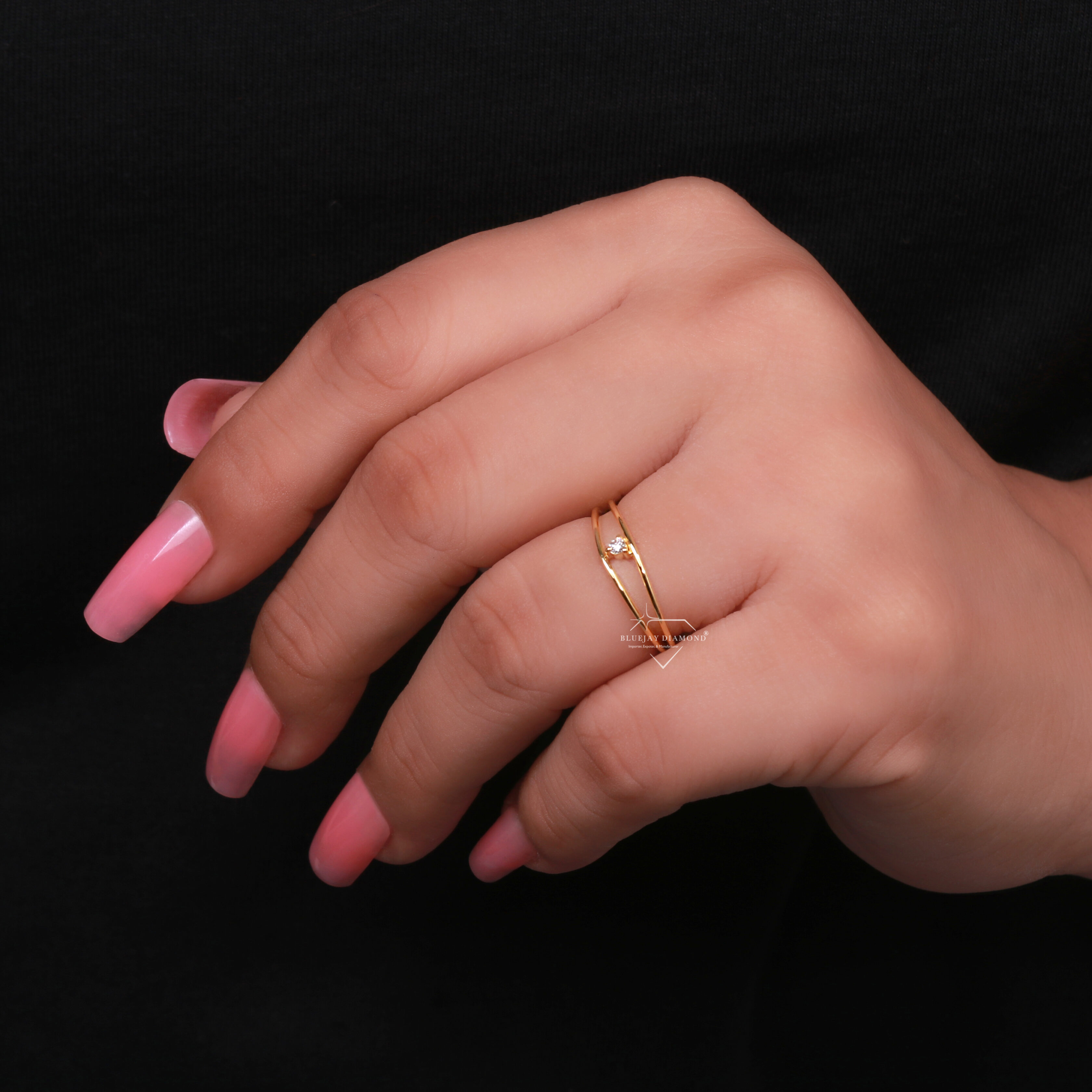 - Bands: The design consists of two slender, parallel gold bands that curve around the finger, with the single diamond set at the point where they cross over. This style is often referred to as a “parallel bands” or “dual band” ring.