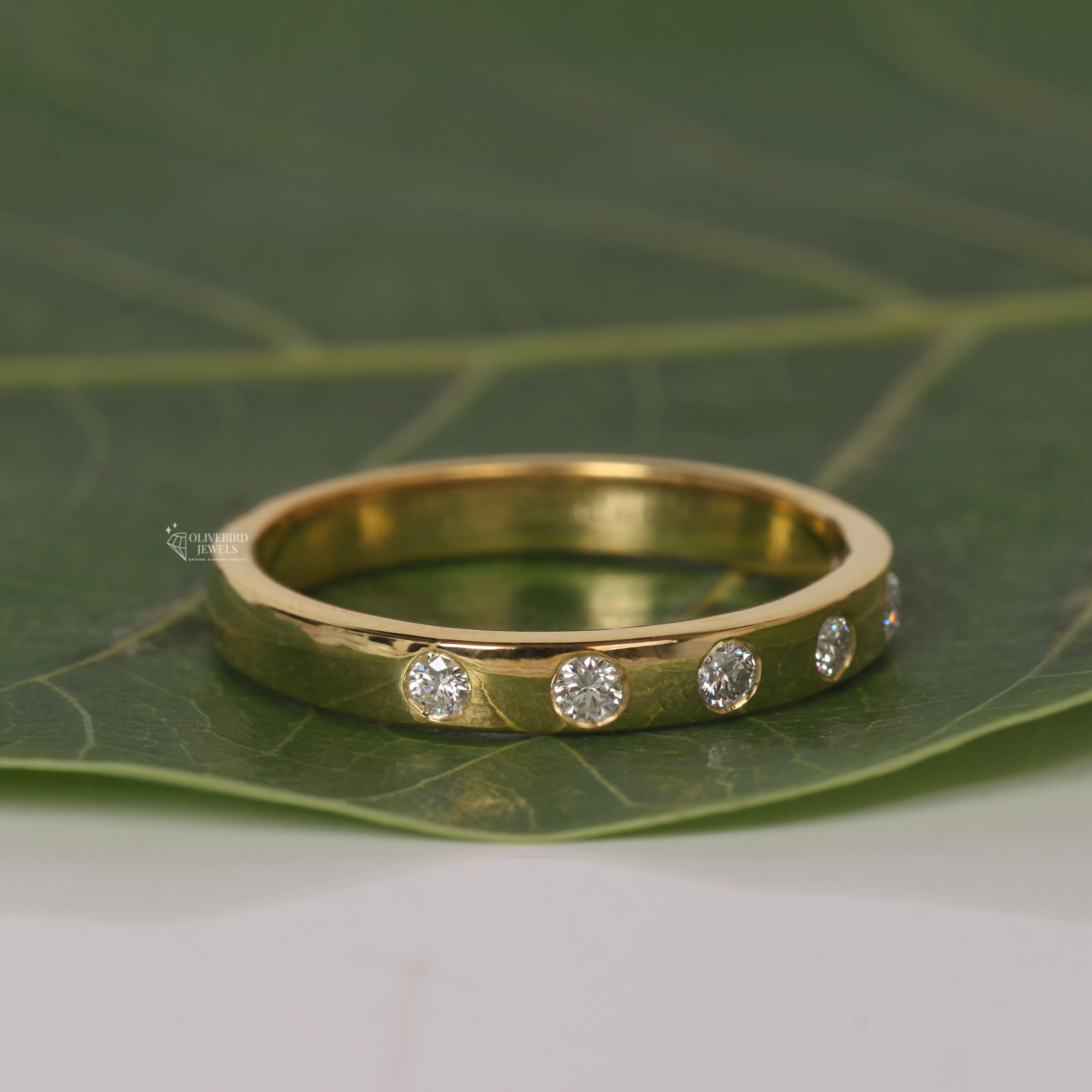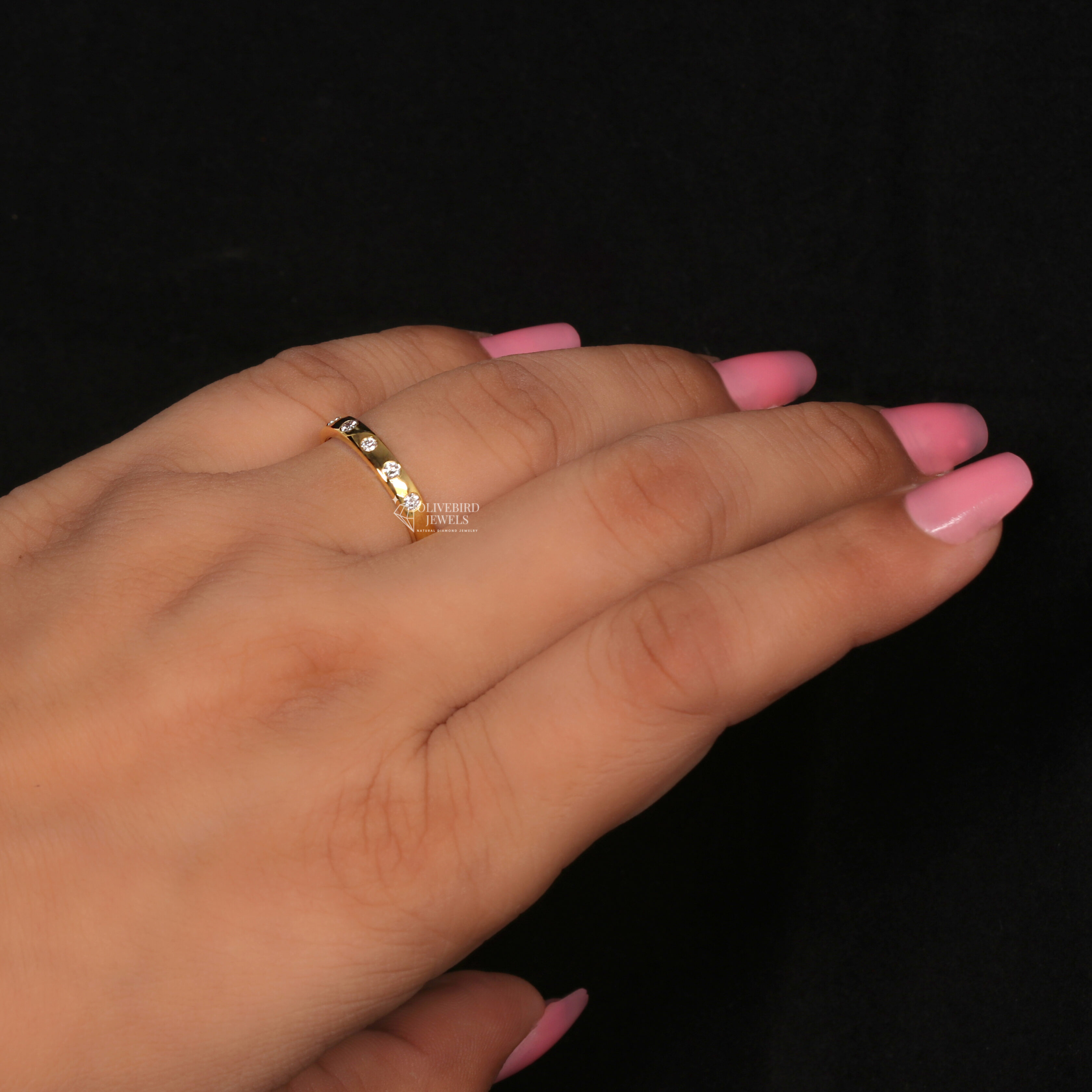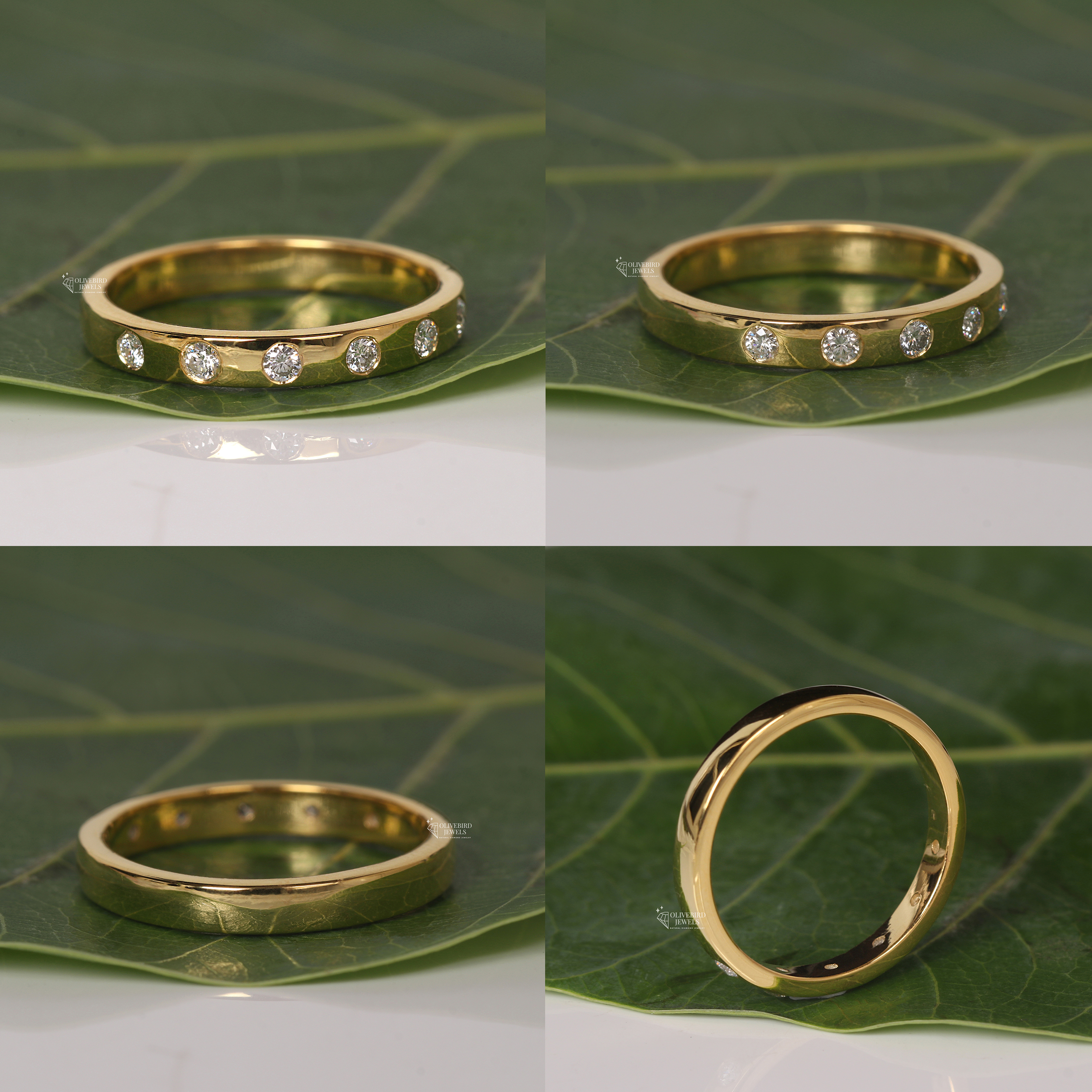 - Each diamond appears to be set in a flush/gypsy setting where the stone sits level with the ring’s surface.