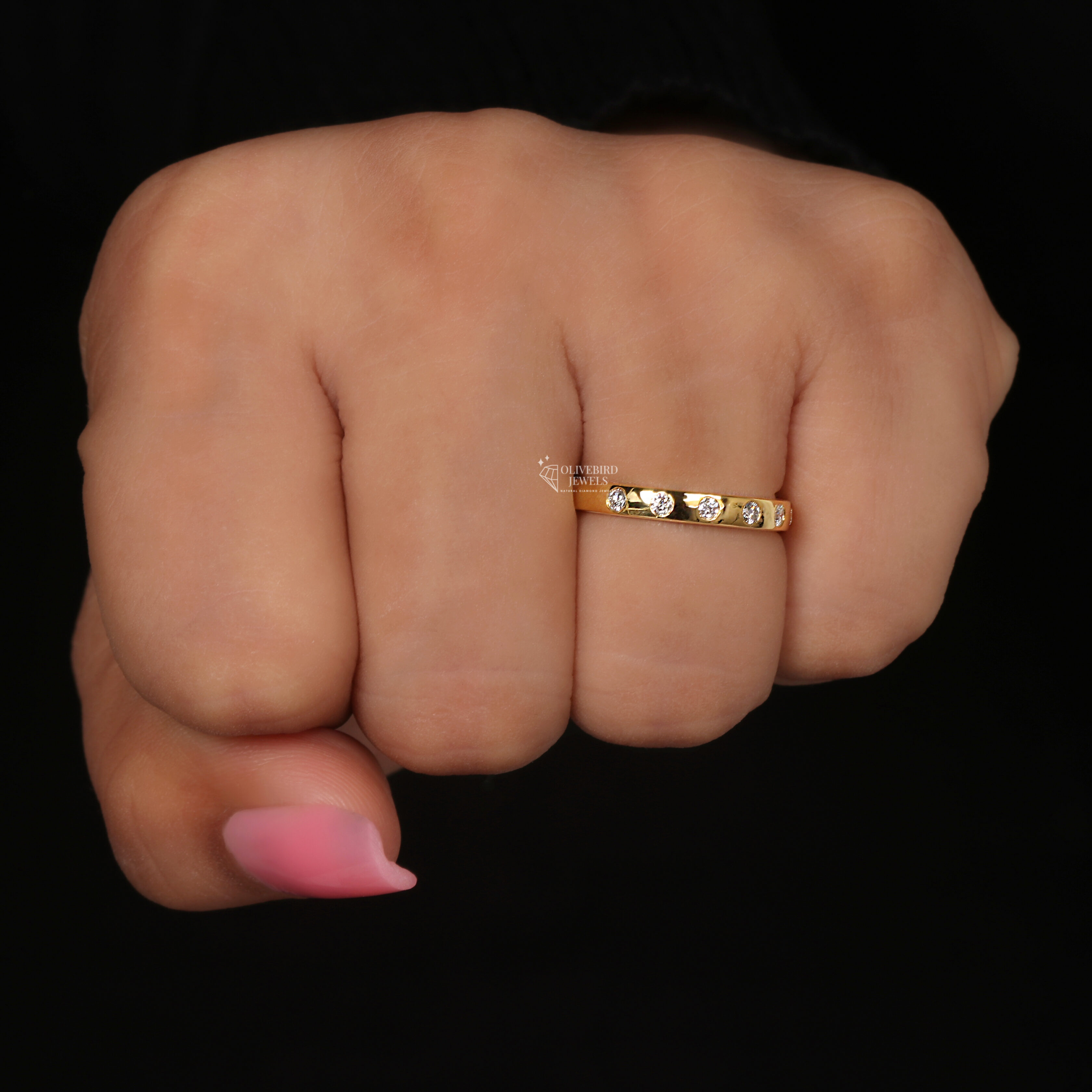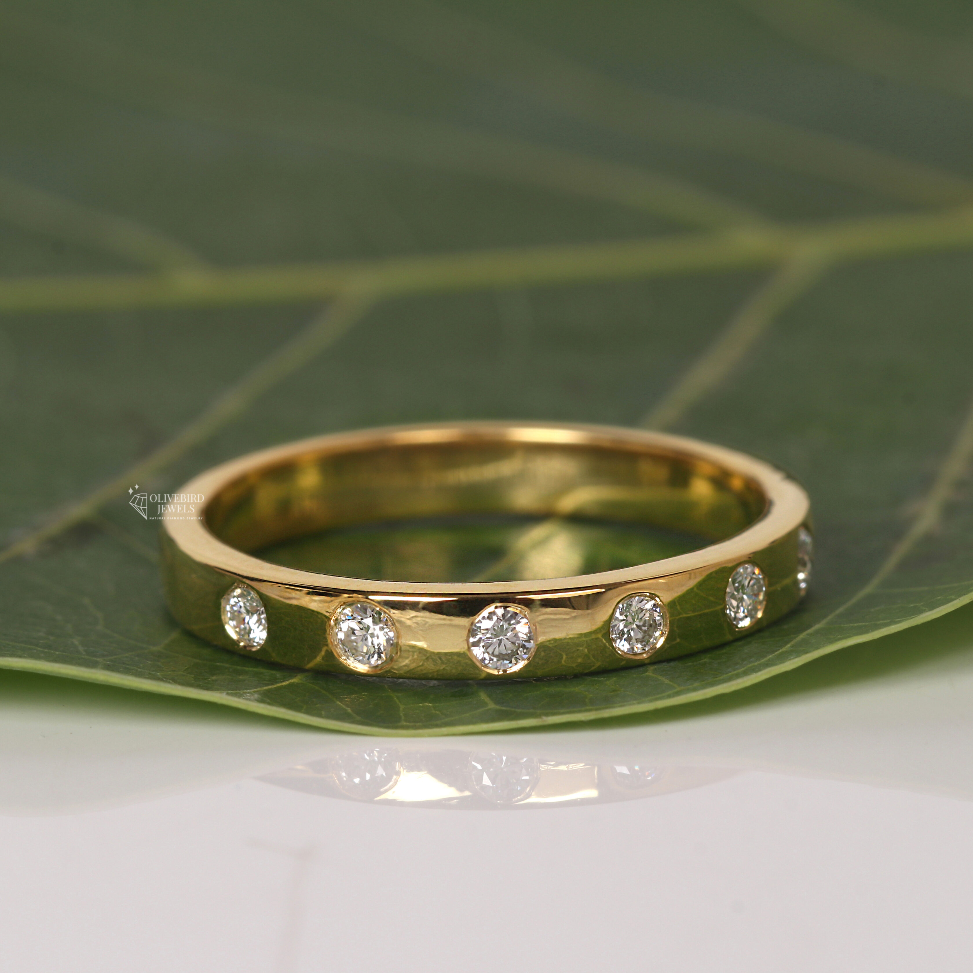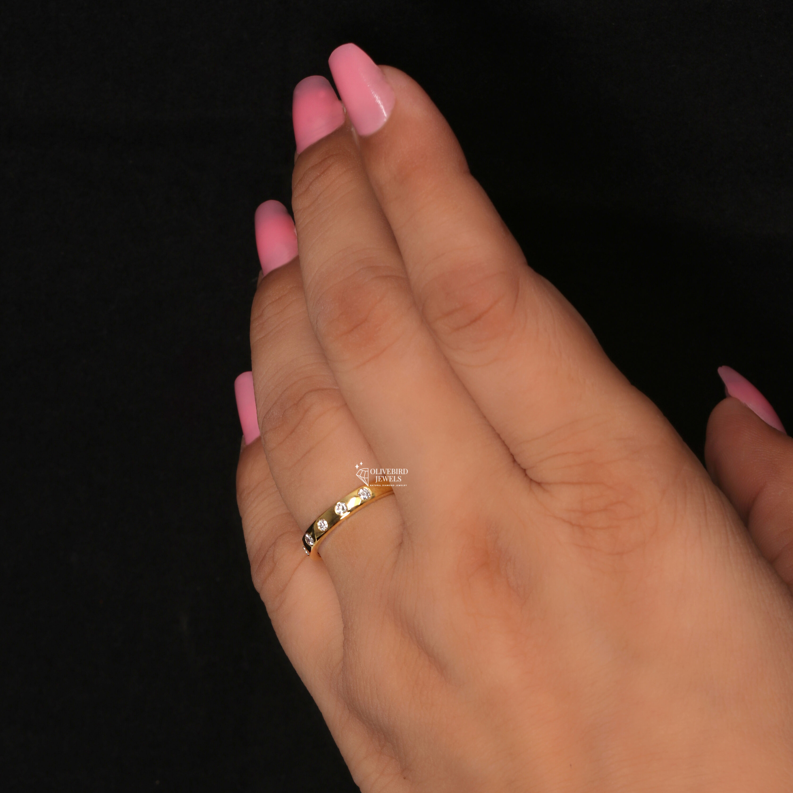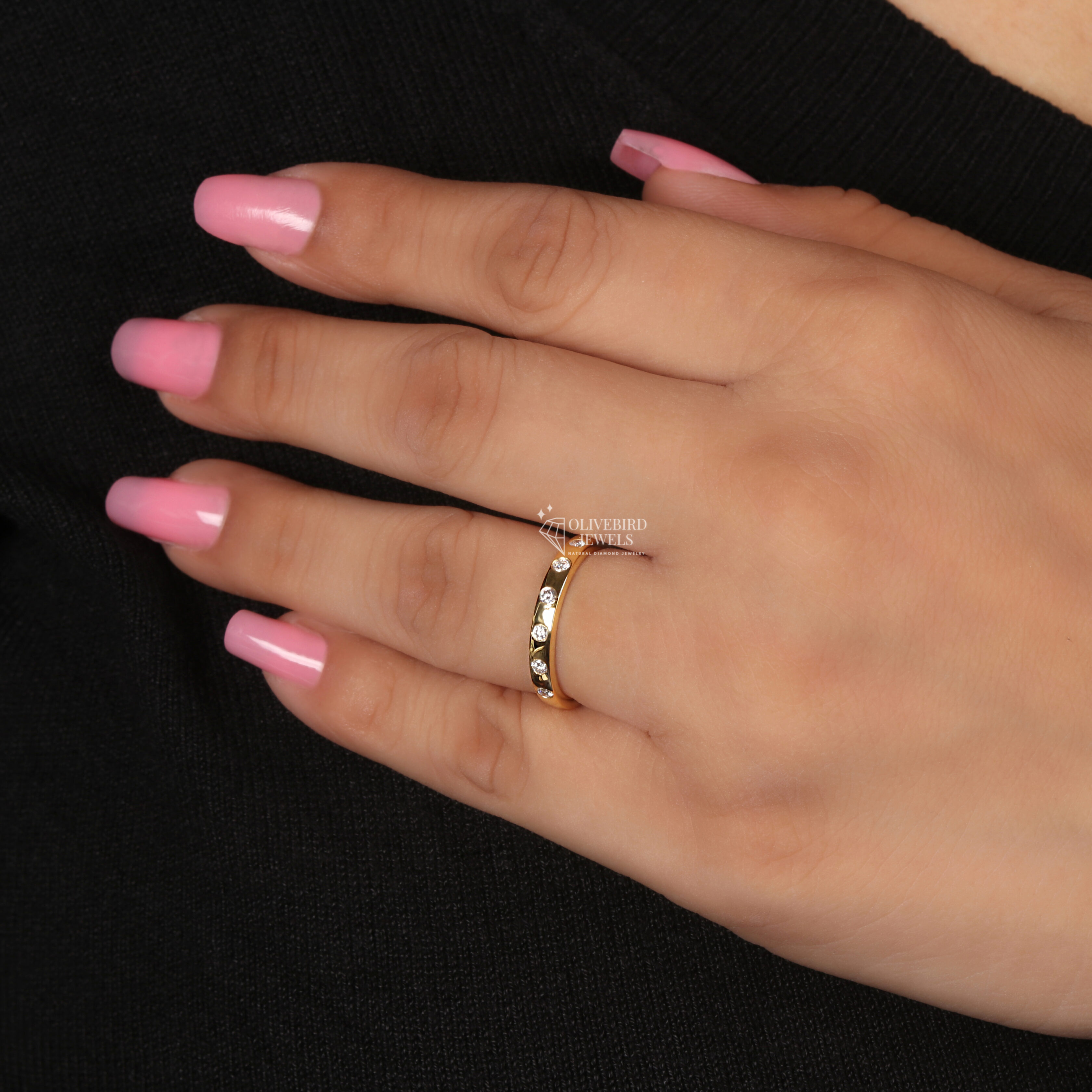 - Each diamond appears to be set in a flush/gypsy setting where the stone sits level with the ring’s surface.