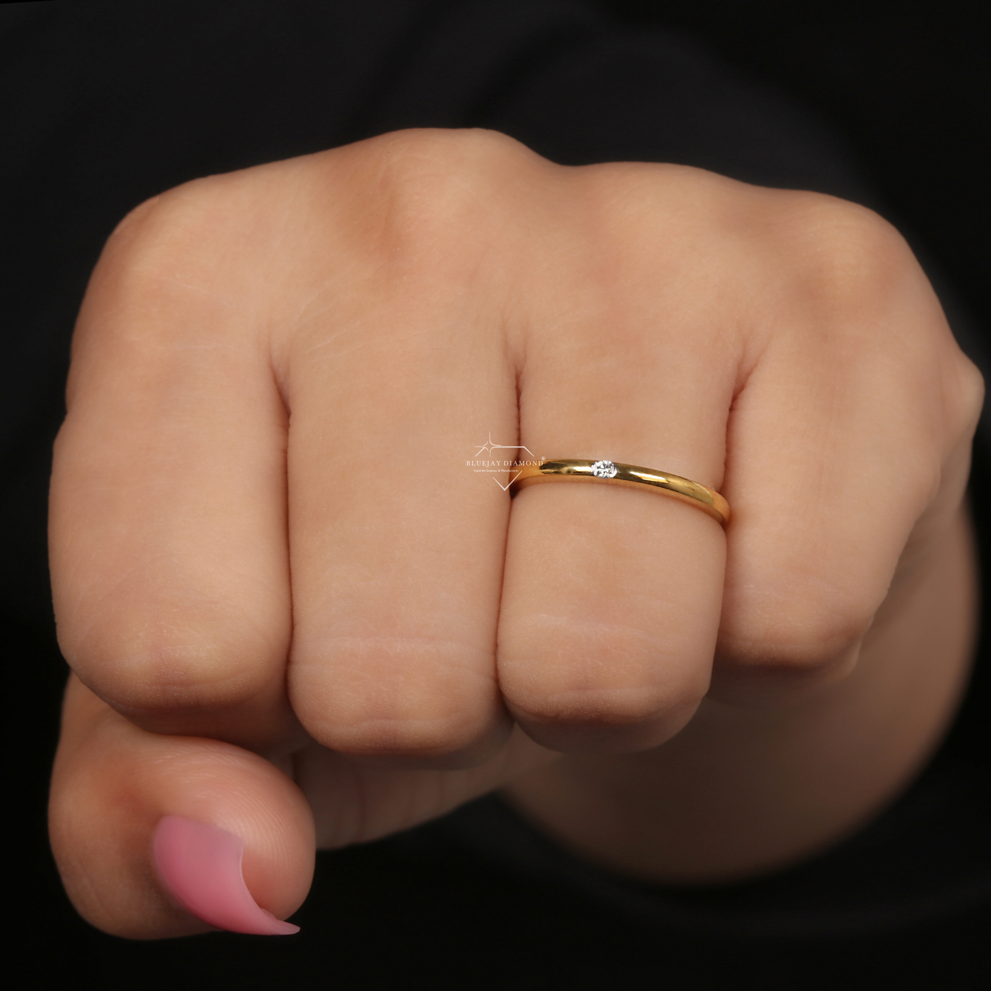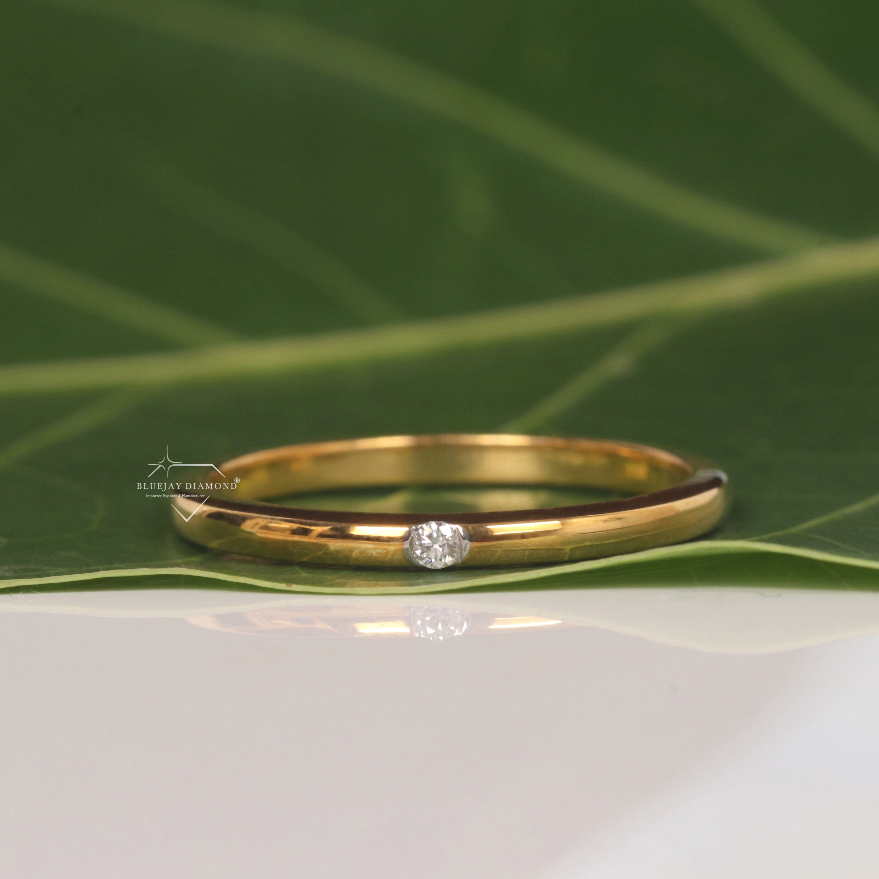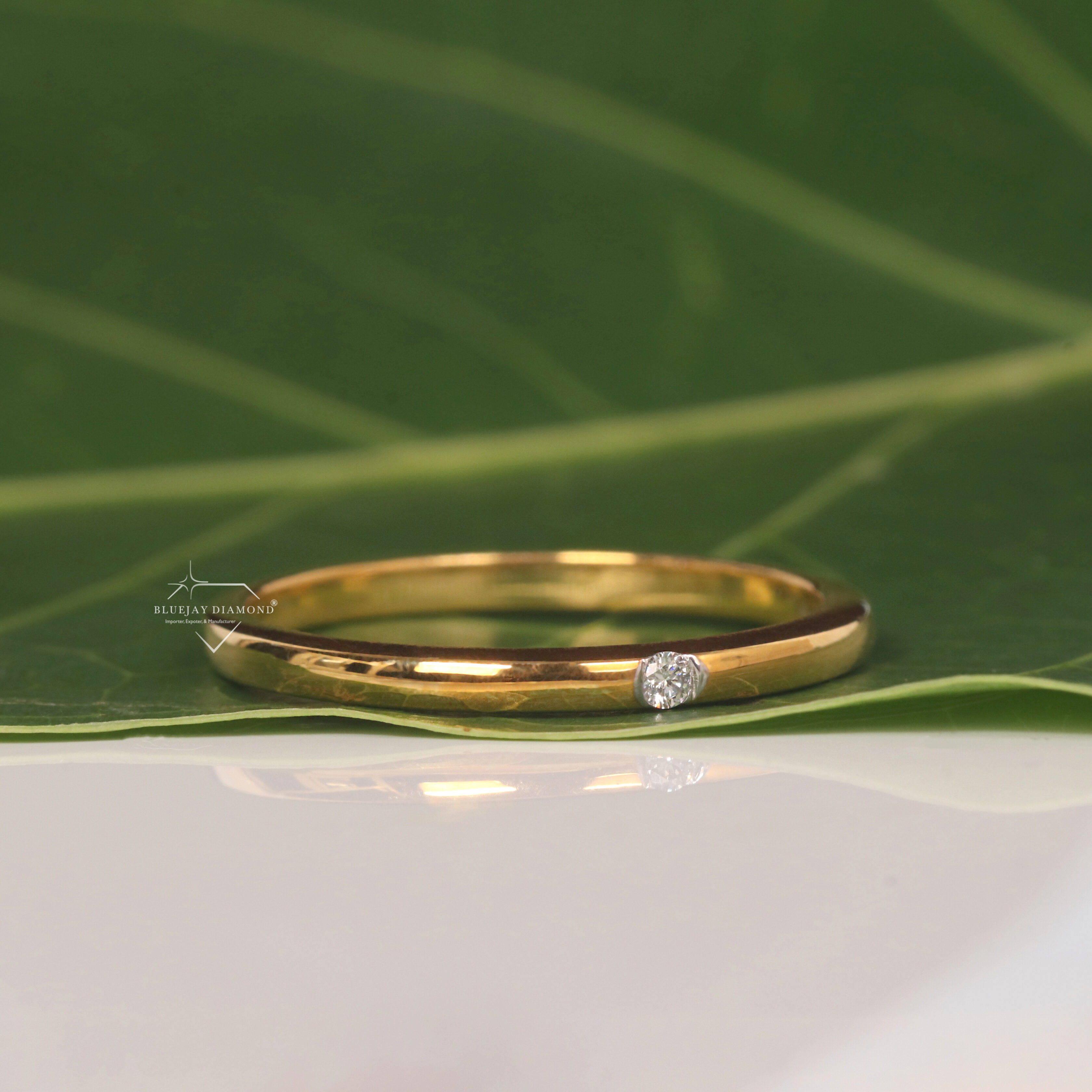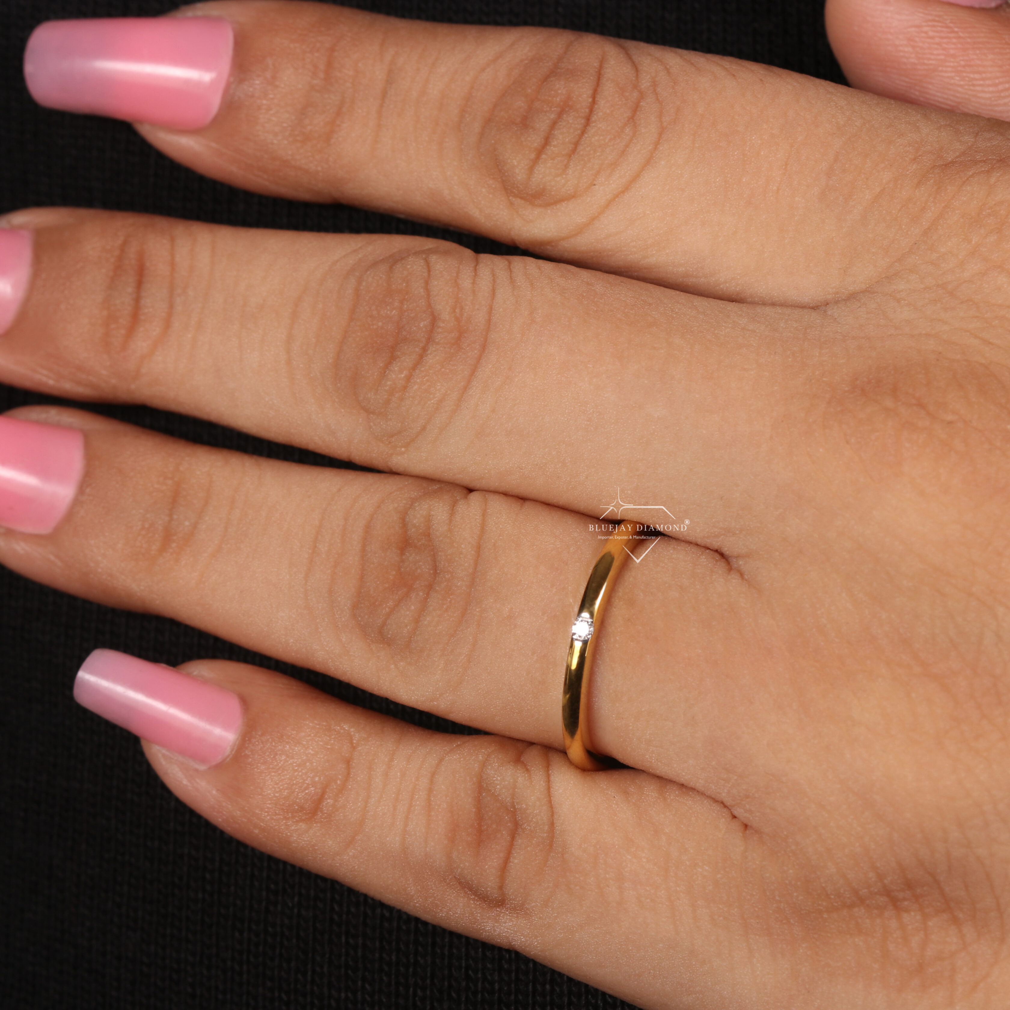 - Setting: The diamond is set using a flush or gypsy setting, where the stone is nestled securely within a small opening of the band, making it smooth and ideal for everyday wear.