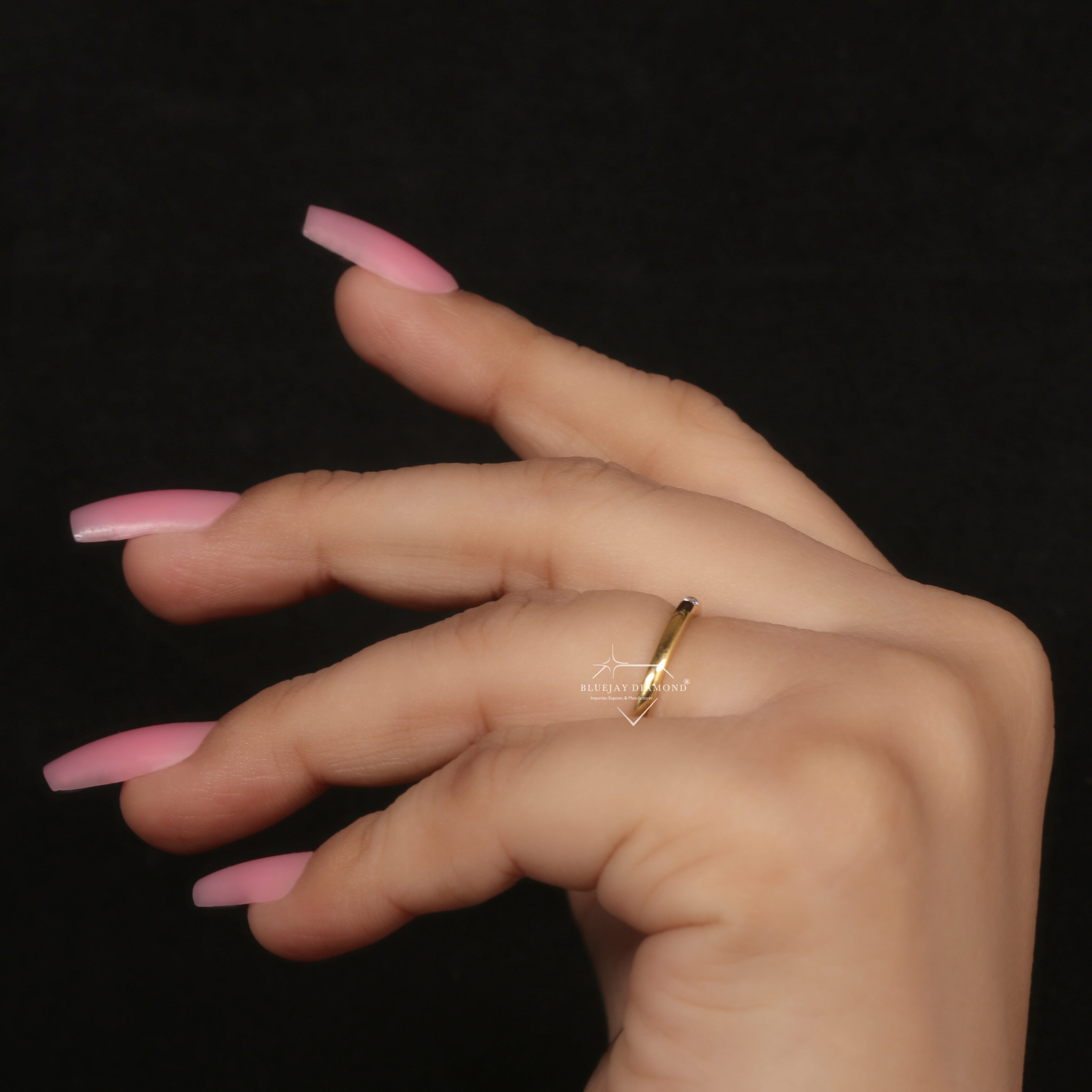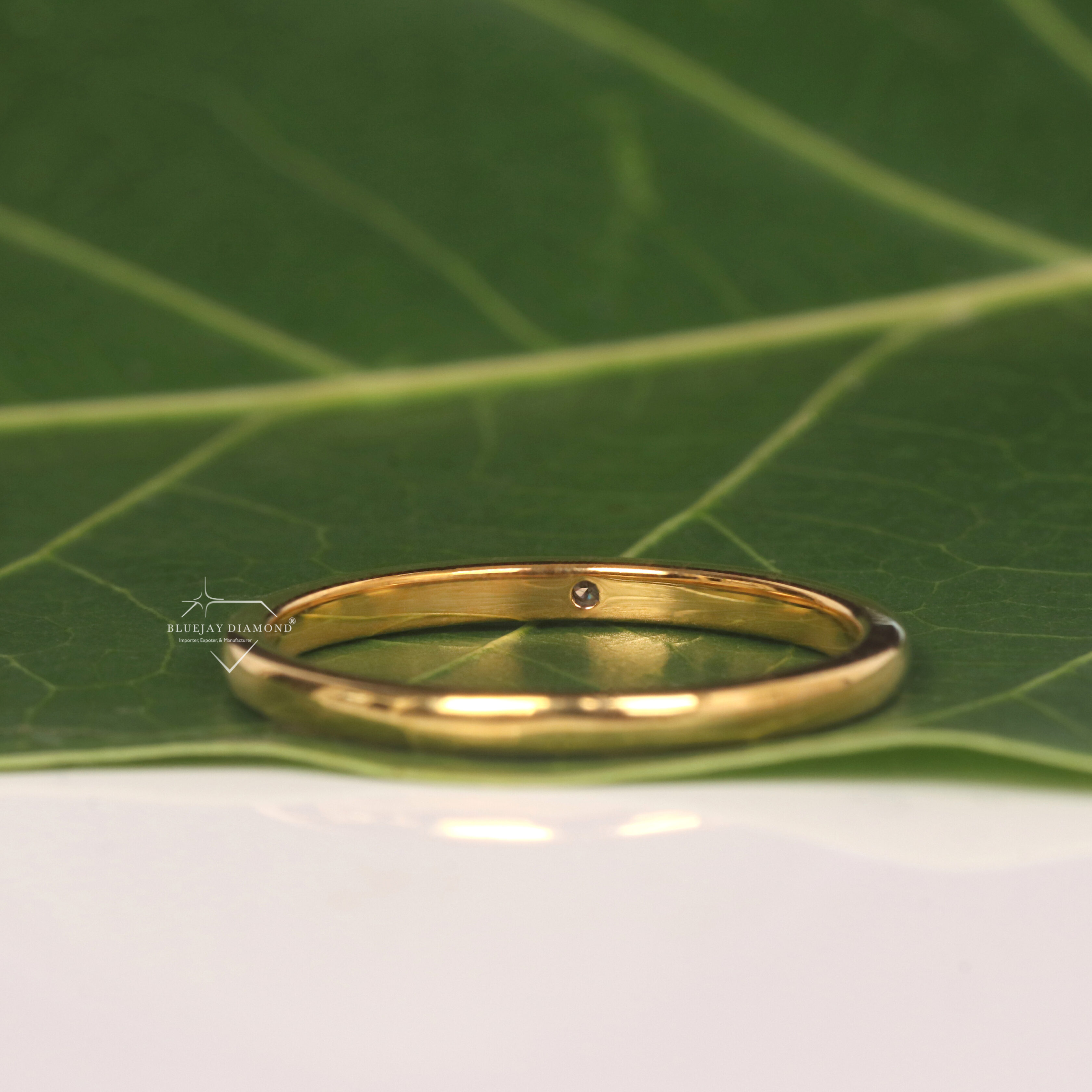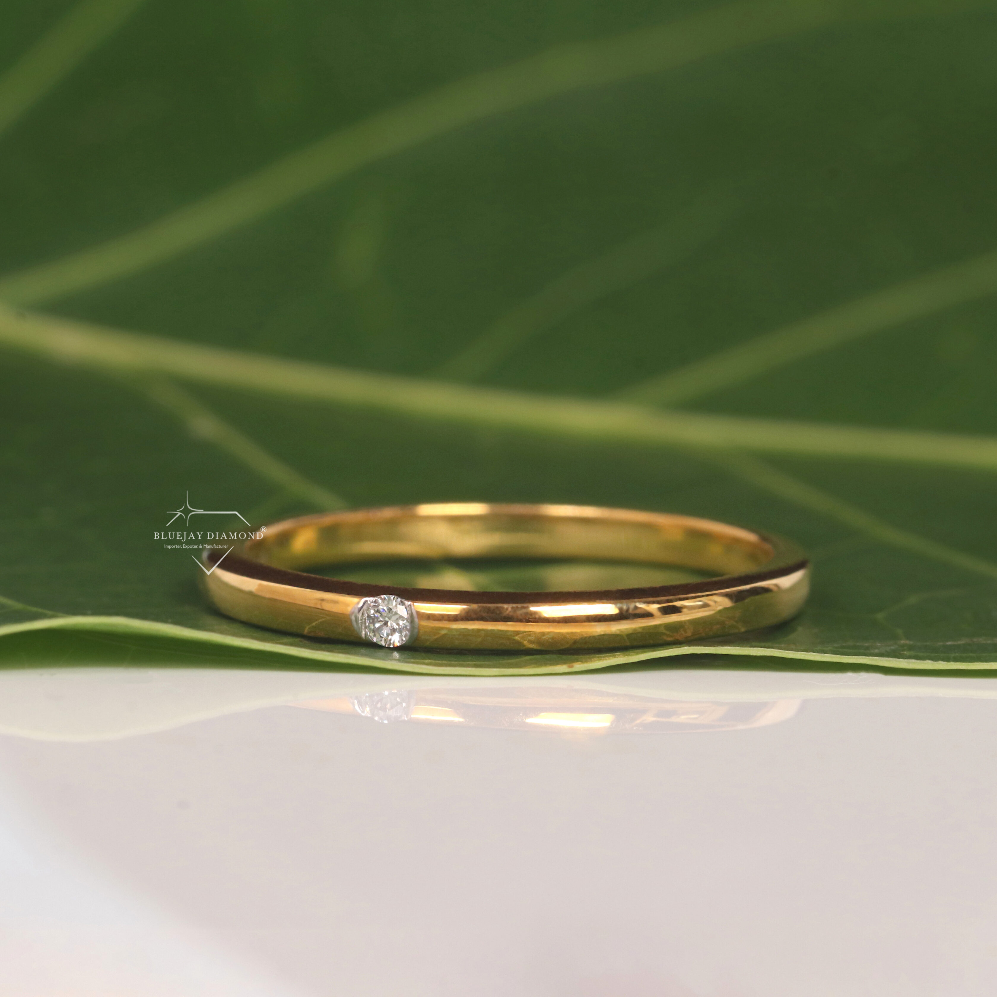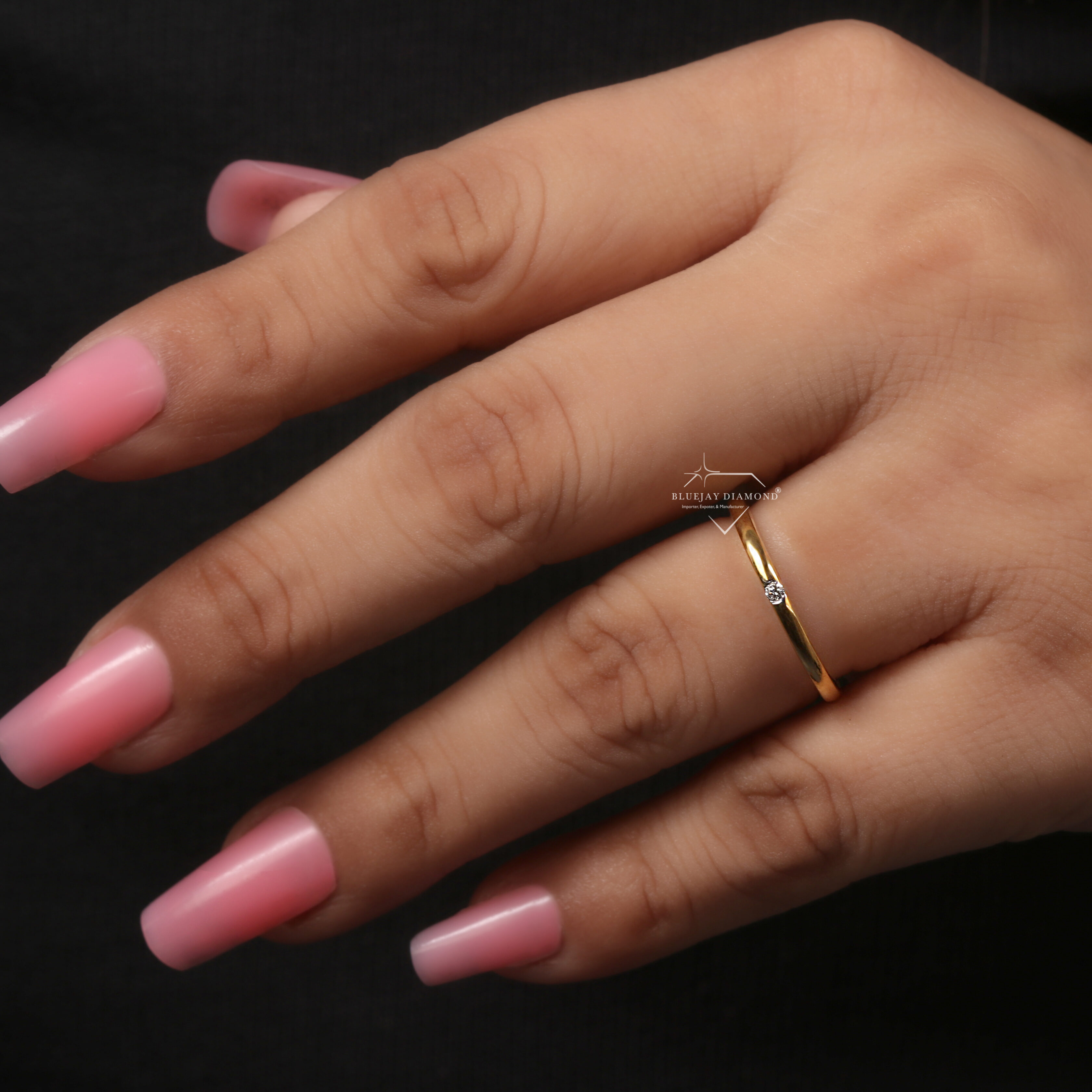 - Setting: The diamond is set using a flush or gypsy setting, where the stone is nestled securely within a small opening of the band, making it smooth and ideal for everyday wear.